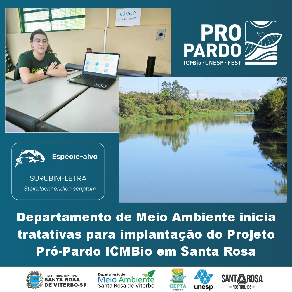 A Diretora de Meio Ambiente, Camila Fedel, se reuniu com a equipe do Projeto Pró-Pardo, do ICMBio, para dar início às tratativas da implantação da iniciativa em Santa Rosa de Viterbo. Durante a reunião, foi apresentado o objetivo do projeto, que consiste na coleta de indivíduos selvagens da espécie Surubim-letra (Steindachneridion scriptum), com o propósito de formar um banco genético no ICMBio/CEPTA, em Pirassununga.
