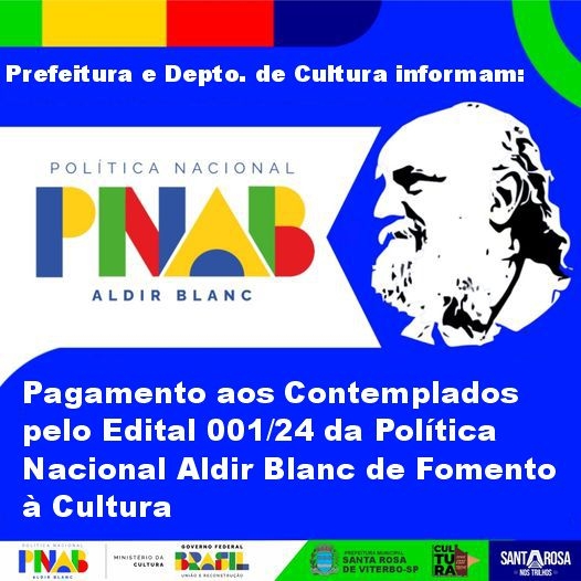 A Prefeitura Municipal de Santa Rosa de Viterbo, por meio do Departamento de Cultura, informa que, no dia 11 de dezembro de 2024, foram realizados os pagamentos aos proponentes contemplados pelo Edital de Prêmios da Política Nacional Aldir Blanc (PNAB), destinado ao fomento à cultura. Ao todo, 13 projetos foram selecionados e cada um recebeu o valor de R$ 14.219,41. Os proponentes têm até outubro de 2025 para executar seus projetos e realizar a devida prestação de contas.