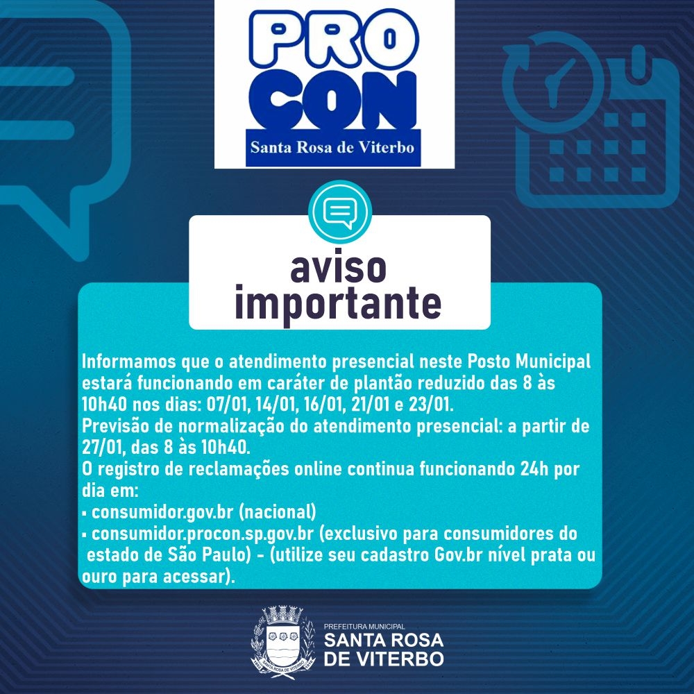 O PROCON informa que, nos próximos dias, o atendimento presencial no Posto Municipal ocorrerá em caráter de plantão reduzido, das 8h às 10h40, nas seguintes datas: