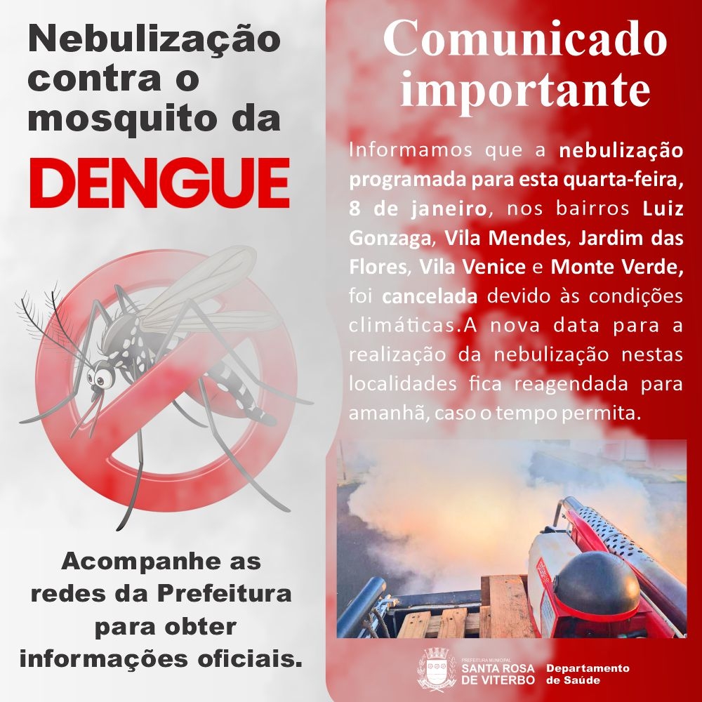 Informamos que a nebulização programada para esta quarta-feira, 8 de janeiro, nos bairros Luiz Gonzaga, Vila Mendes, Jardim das Flores, Vila Venice e Monte Verde, foi cancelada devido às condições climáticas.