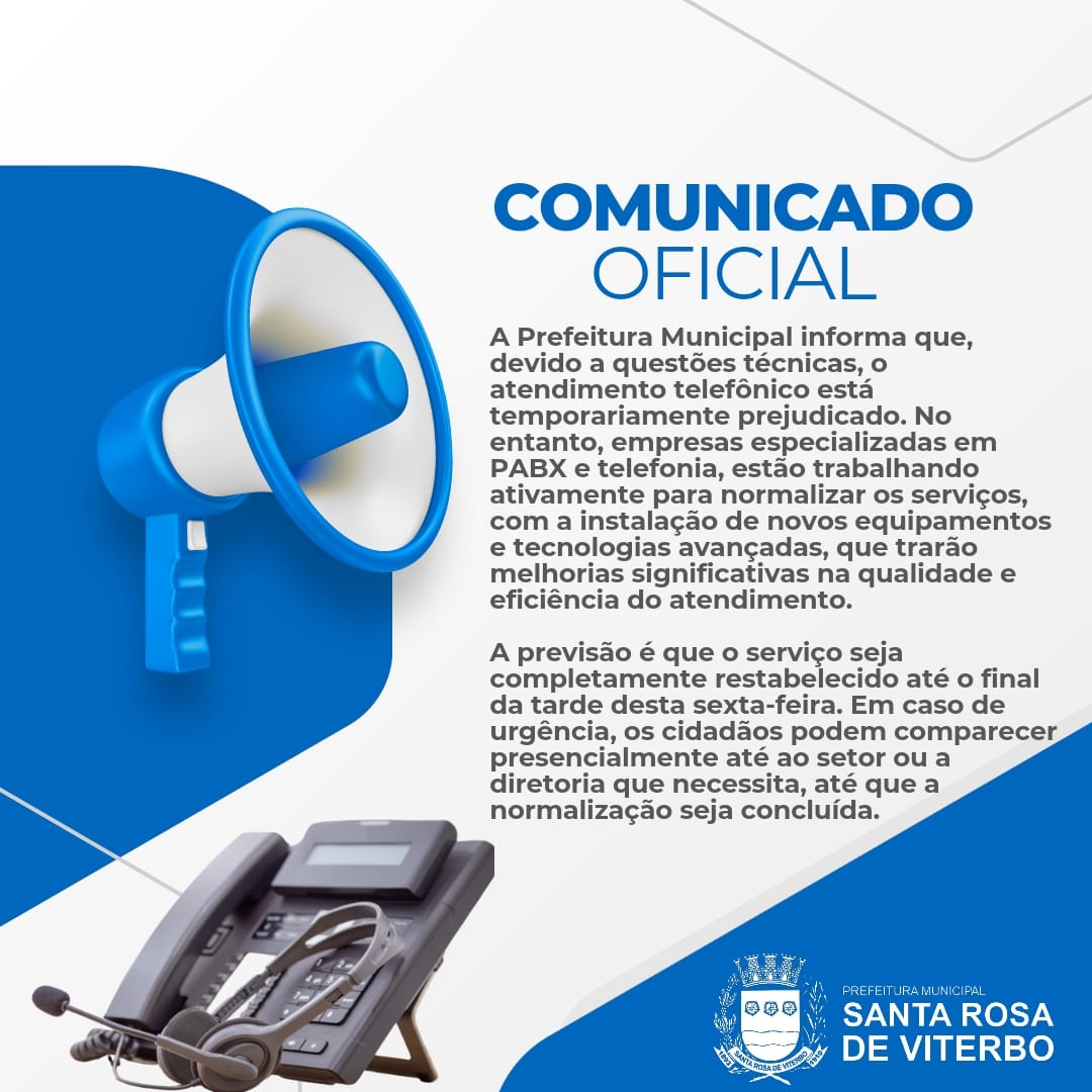 A Prefeitura Municipal informa que, devido a questões técnicas, o atendimento telefônico está temporariamente prejudicado. No entanto, empresas especializadas em PABX e telefonia, estão trabalhando ativamente para normalizar os serviços, com a instalação de novos equipamentos e tecnologias avançadas, que trarão melhorias significativas na qualidade e eficiência do atendimento.