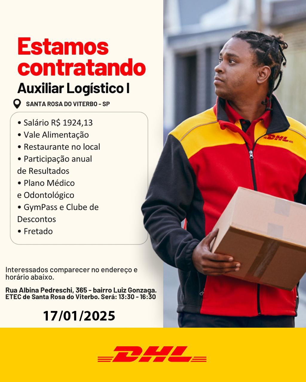 A DHL, com apoio da Diretoria de Desenvolvimento Econômico e da ETEC, promoverá um mutirão de empregos em Santa Rosa de Viterbo para preenchimento de vagas no cargo de Auxiliar Logístico I.