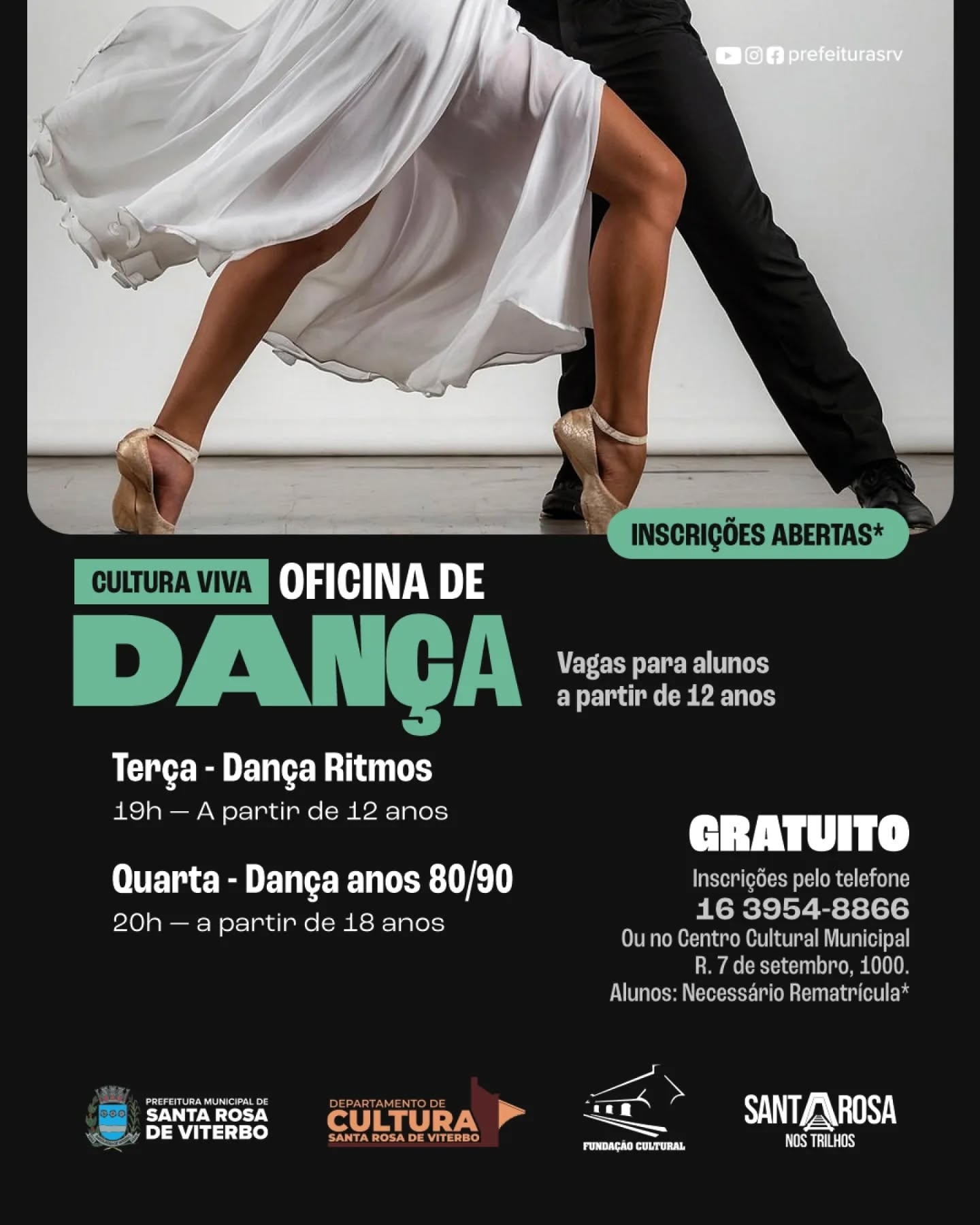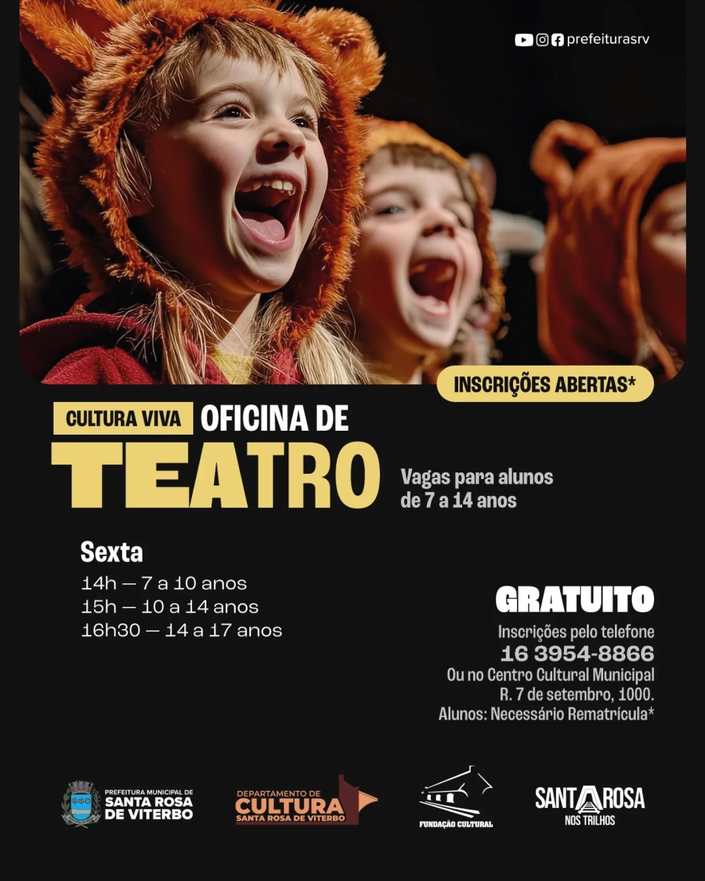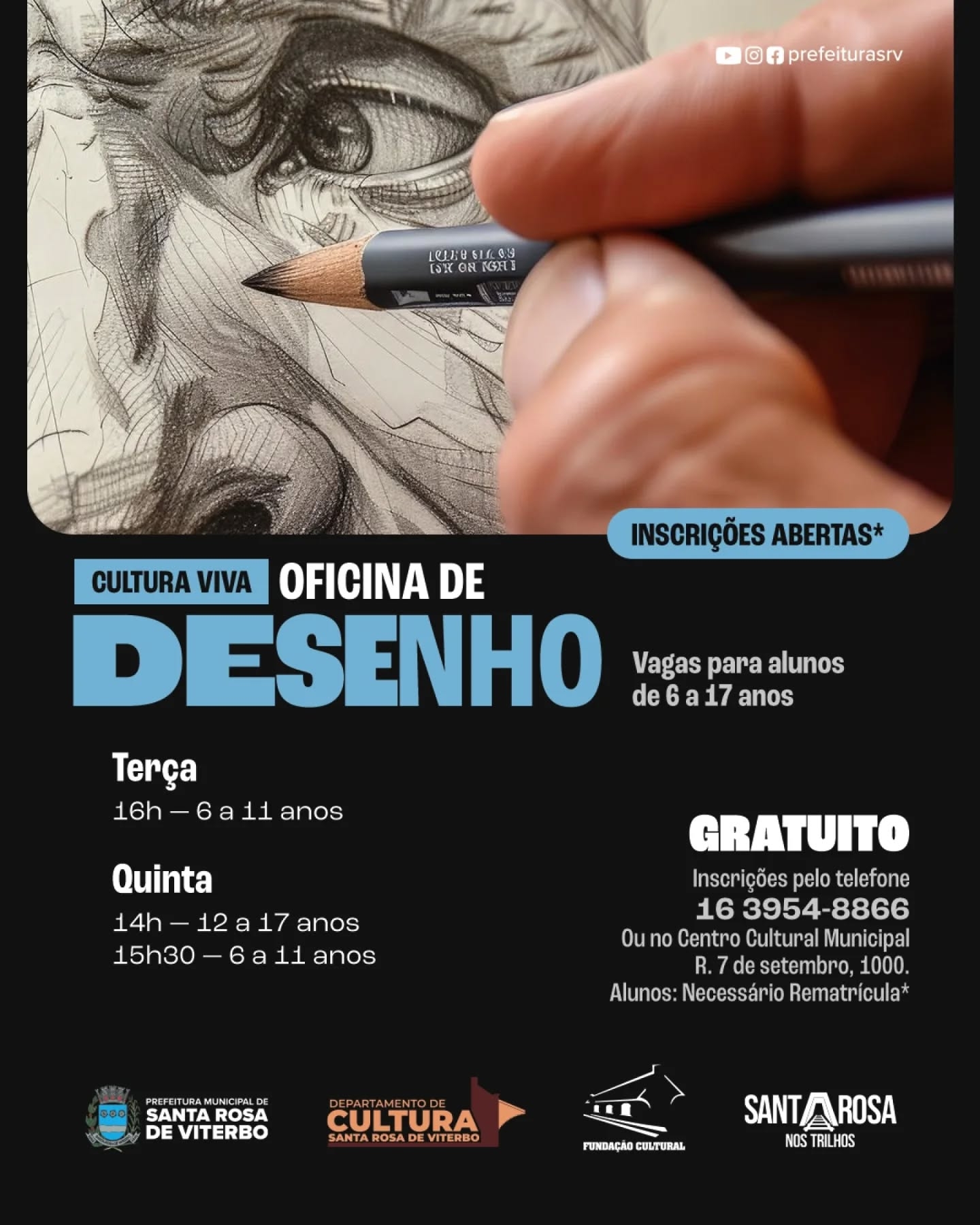 O Departamento de Cultura da Prefeitura de Santa Rosa de Viterbo anuncia a abertura das inscrições para as oficinas culturais oferecidas no município. As vagas estão disponíveis para as modalidades de ballet, desenho, dança e teatro, e são uma excelente oportunidade para quem deseja desenvolver habilidades artísticas e culturais.