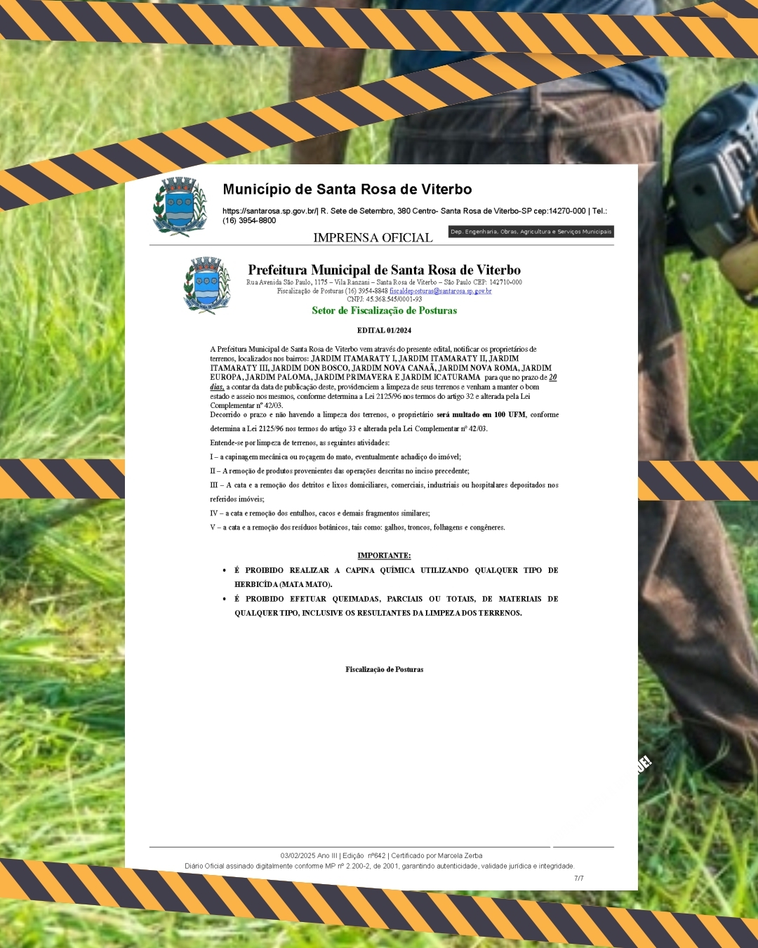 O Setor de Posturas, por meio do presente edital, notifica os proprietários de terrenos localizados nos seguintes bairros: Jardim Itamaraty I, Jardim Itamaraty II, Jardim Itamaraty III, Jardim Don Bosco, Jardim Nova Canaã, Jardim Nova Roma, Jardim Europa, Jardim Paloma, Jardim Primavera e Jardim Icaturama, para que, no prazo de 20 dias, a contar da data de publicação deste, providenciem a limpeza de seus terrenos e mantenham o bom estado e asseio nos mesmos, conforme determina a Lei Municipal nº 2125/96, nos termos do artigo 32, e alterada pela Lei Complementar nº 42/03.