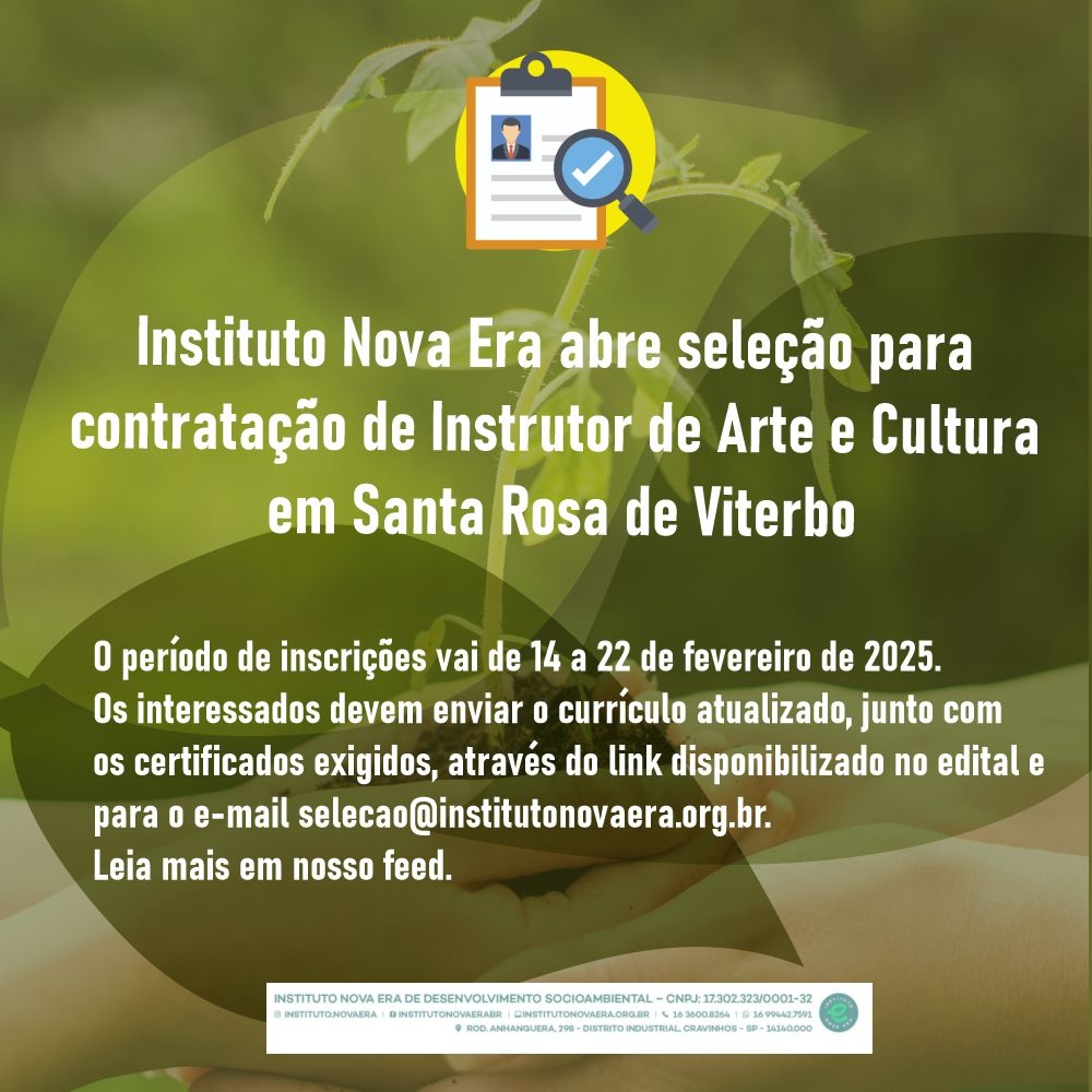 Instituto Nova Era abre seleção para contratação de Instrutor de Arte e Cultura em Santa Rosa de Viterbo