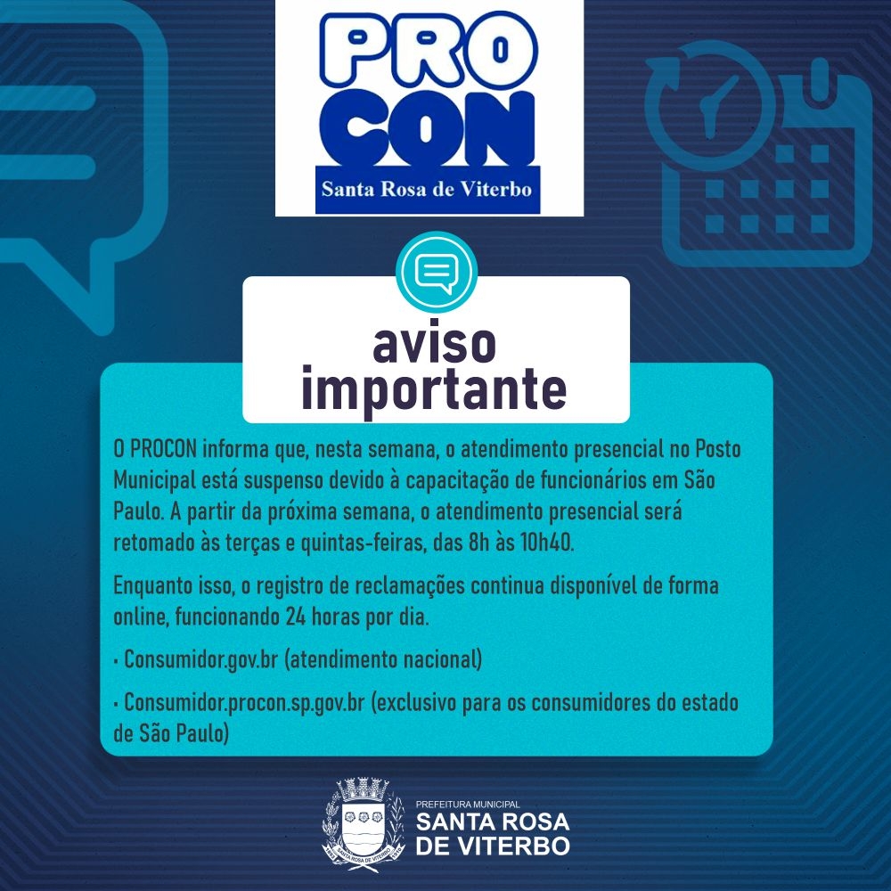 O PROCON informa que, nesta semana, o atendimento presencial no Posto Municipal está suspenso devido à capacitação de funcionários em São Paulo. A partir da próxima semana, o atendimento presencial será retomado às terças e quintas-feiras, das 8h às 10h40.