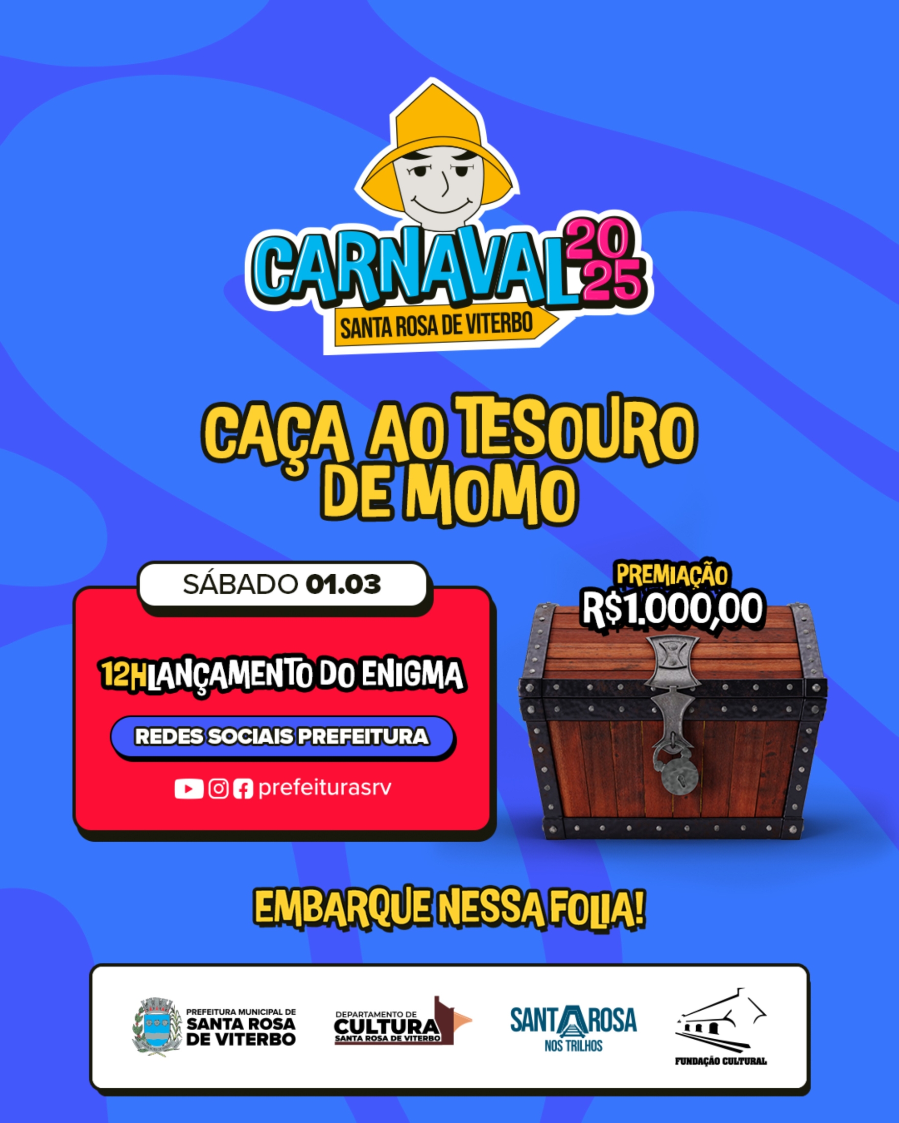 Daqui a 48 horas Santa Rosa poderá desfrutar de mais uma edição da Caça ao Tesouro de Momo. O enigma que, decifrado, permite o encontro do Tesouro, será lançado, aqui neste espaço, no próximo sábado, exatamente ao meio-dia, valendo o prêmio de $ 1.000,00.