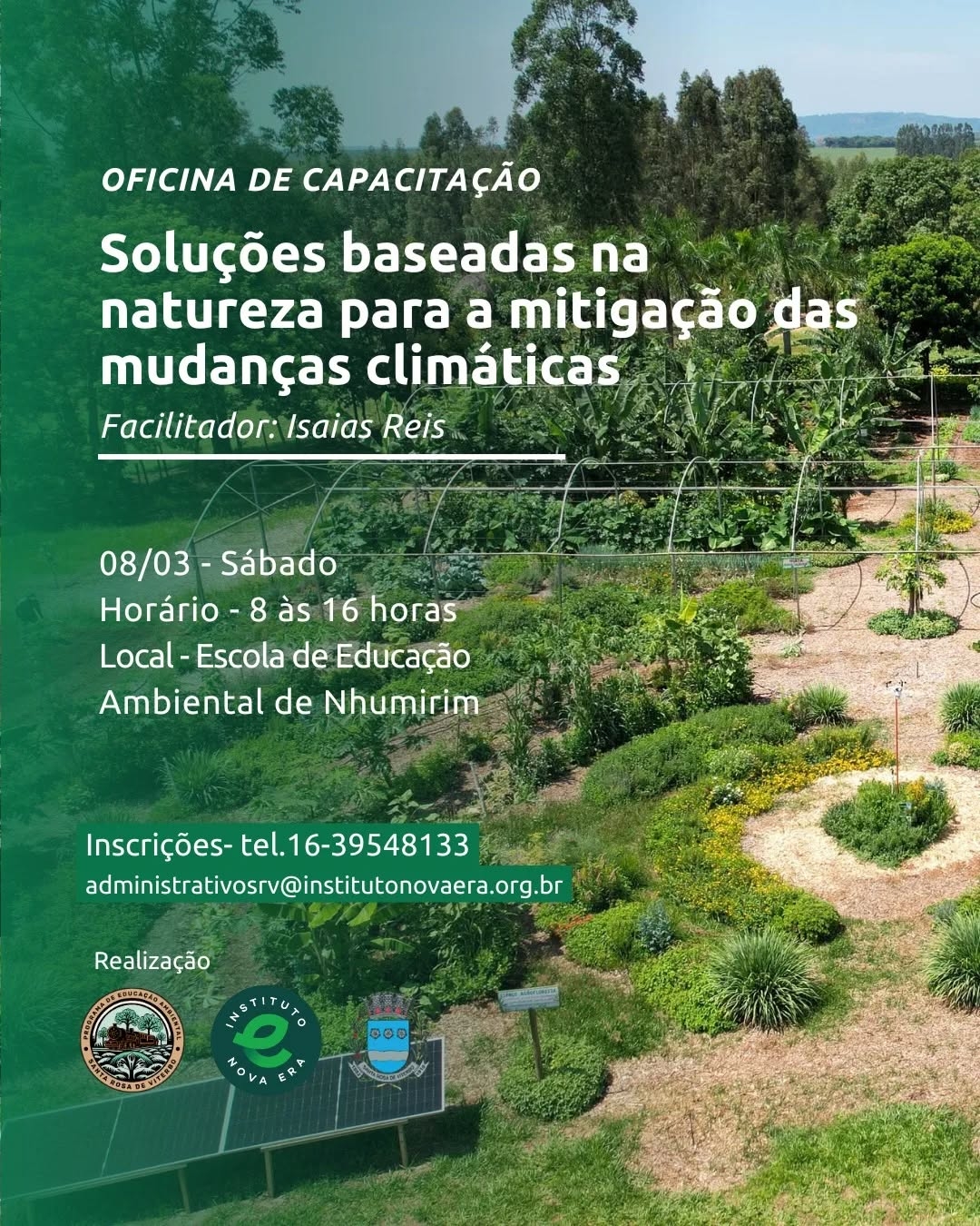 A Escola de Educação Ambiental de Nhumirim sediará, no próximo dia 08 de março (sábado), das 8h às 16h, o curso gratuito “Soluções Baseadas na Natureza para Mitigação das Mudanças Climáticas”. A iniciativa, que faz parte do Programa de Educação Ambiental de Santa Rosa de Viterbo, uma parceria da Prefeitura Municipal com o Instituto Nova Era.