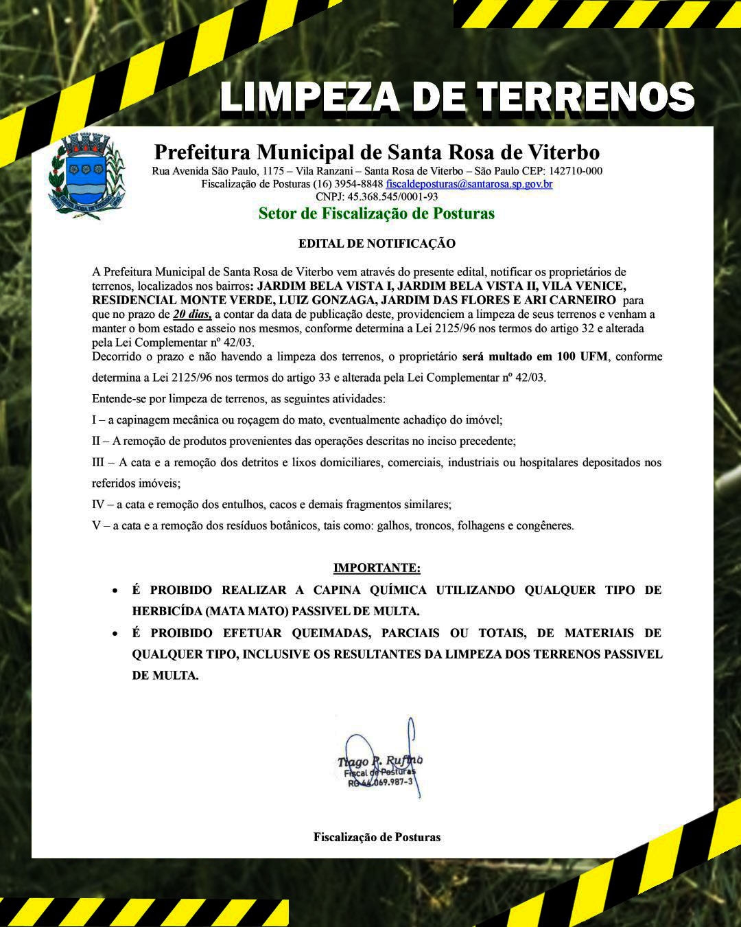 O Setor de Fiscalização de Posturas da Prefeitura Municipal, vem, através do presente edital, notificar os proprietários de terrenos localizados nos seguintes bairros: Jardim Bela Vista I, Jardim Bela Vista II, Vila Venice, Residencial Monte Verde, Luiz Gonzaga, Jardim das Flores e Ari Carneiro.