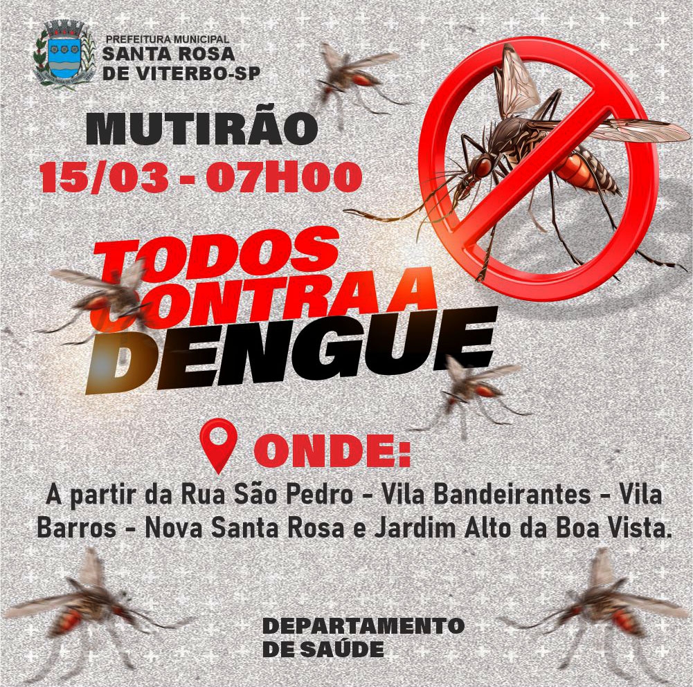 Neste sábado, 15 de março, o Departamento de Saúde realizará mais um mutirão contra a dengue nas seguintes localidades: A partir da Rua São Pedro, Vila Bandeirantes, Vila Barros, Nova Santa Rosa e Jardim Alto da Boa Vista. As atividades acontecerão das 7:00h às 12:00h.