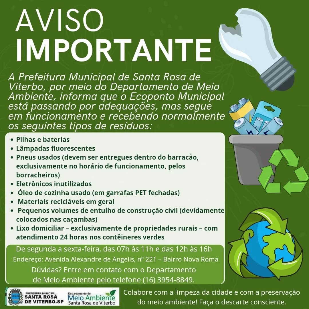 A Prefeitura Municipal de Santa Rosa de Viterbo, por meio do Departamento de Meio Ambiente, informa que o Ecoponto Municipal está passando por adequações, mas segue em funcionamento e recebendo normalmente os seguintes tipos de resíduos: