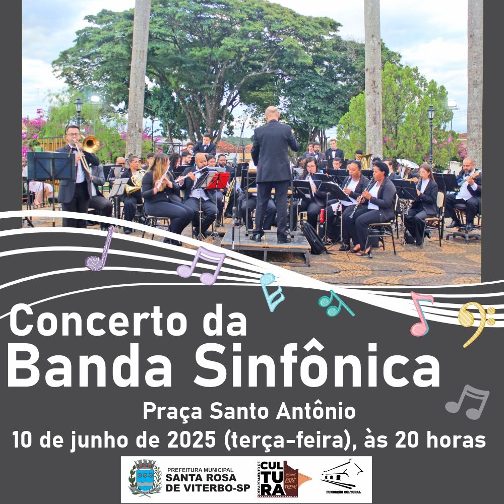 A Banda Sinfônica de Santa Rosa de Viterbo tem o prazer de convidar você para um concerto especial no Largo da Praça Santo Antônio, no dia 10 de junho de 2025 (terça-feira), às 20 horas.