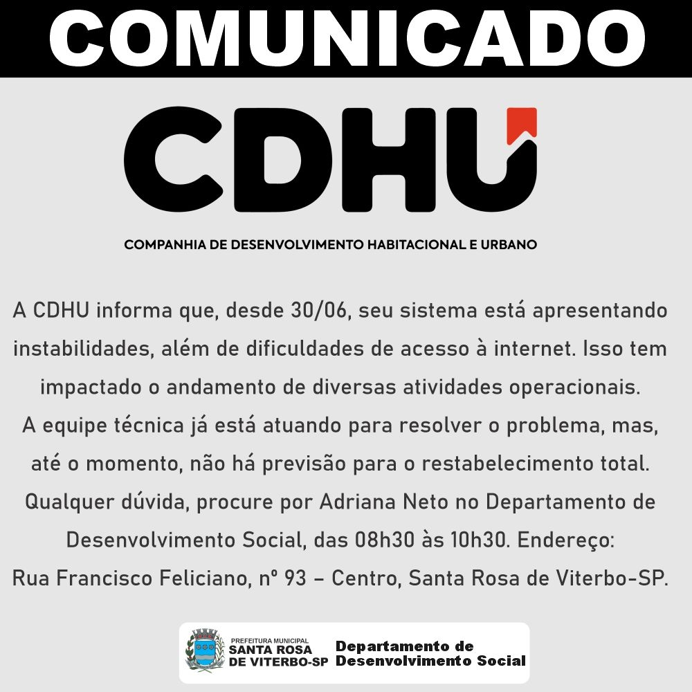 A CDHU informa que, desde 30/06, seu sistema está apresentando instabilidades, além de dificuldades de acesso à internet. Isso tem impactado o andamento de diversas atividades operacionais.
