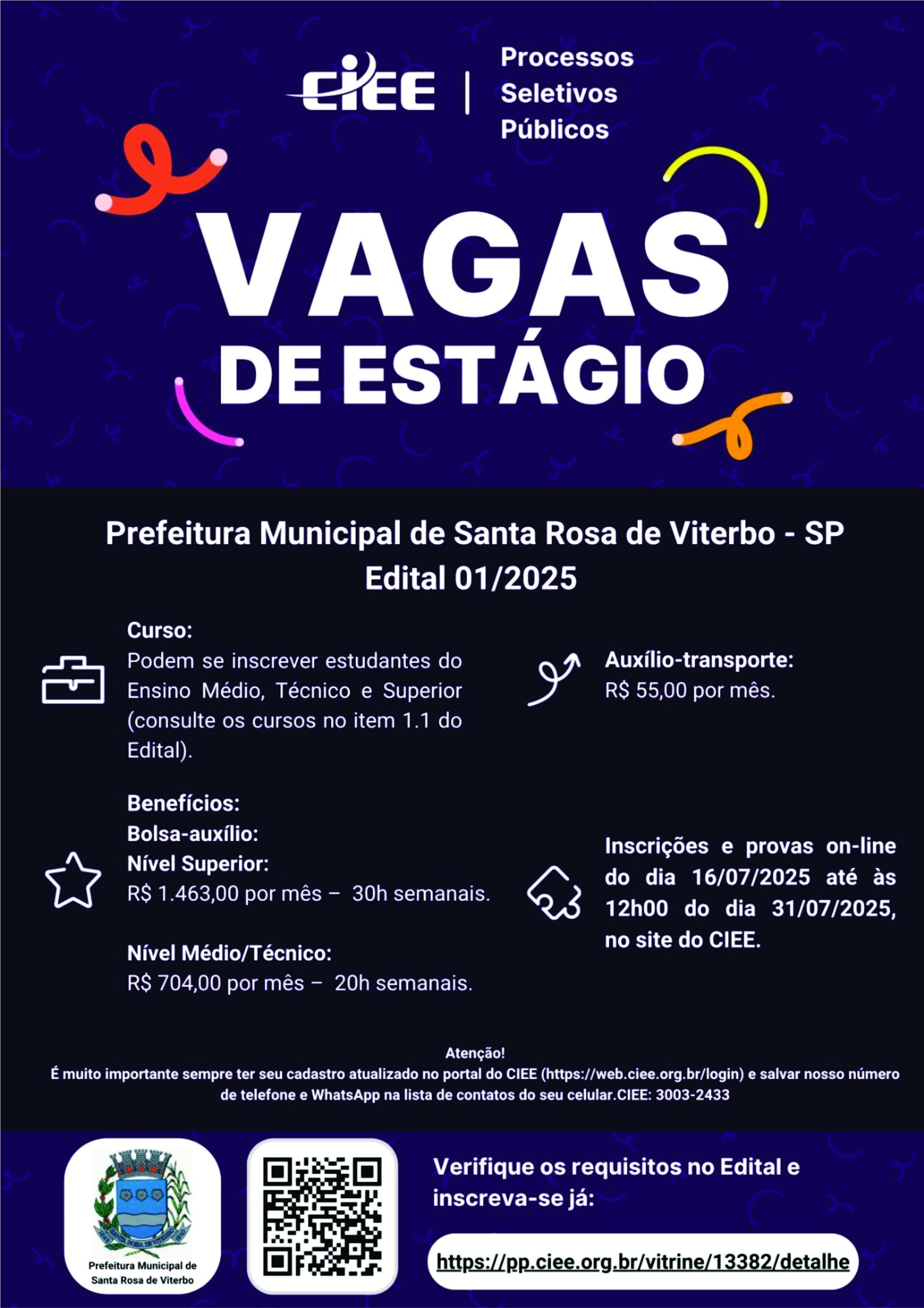 A Prefeitura Municipal de Santa Rosa de Viterbo - SP, em parceria com o CIEE (Centro de Integração Empresa-Escola), abriu inscrições para o processo seletivo de estágio conforme o Edital 01/2025.