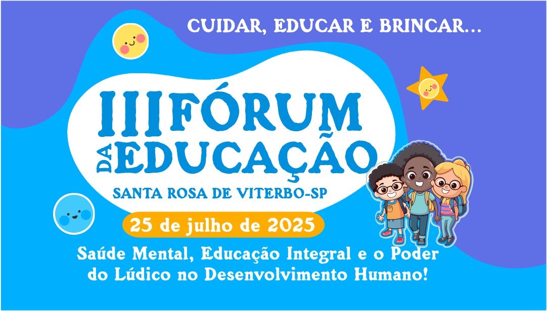 A Prefeitura de Santa Rosa de Viterbo, através do Departamento Municipal de Educação, promove nesta sexta-feira, dia 25 de julho o III Fórum da Educação, com o tema "Cuidar, Educar e Brincar". O evento será realizado no Espaço Raviga, no Jardim Nova Roma, em dois períodos: das 07h30 às 11h30 e das 13h30 às 17h30.