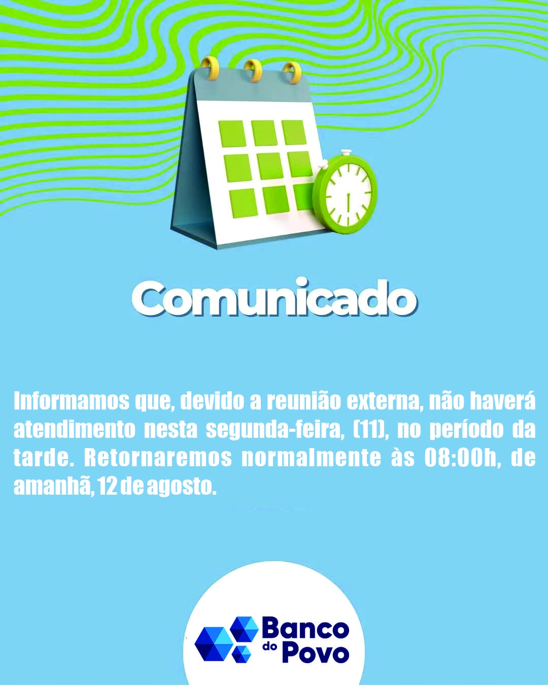 Informamos que nesta segunda-feira (11/08) o Sebrae Aqui e o Banco do Povo não terão atendimento no período da tarde, devido à realização de reunião externa.