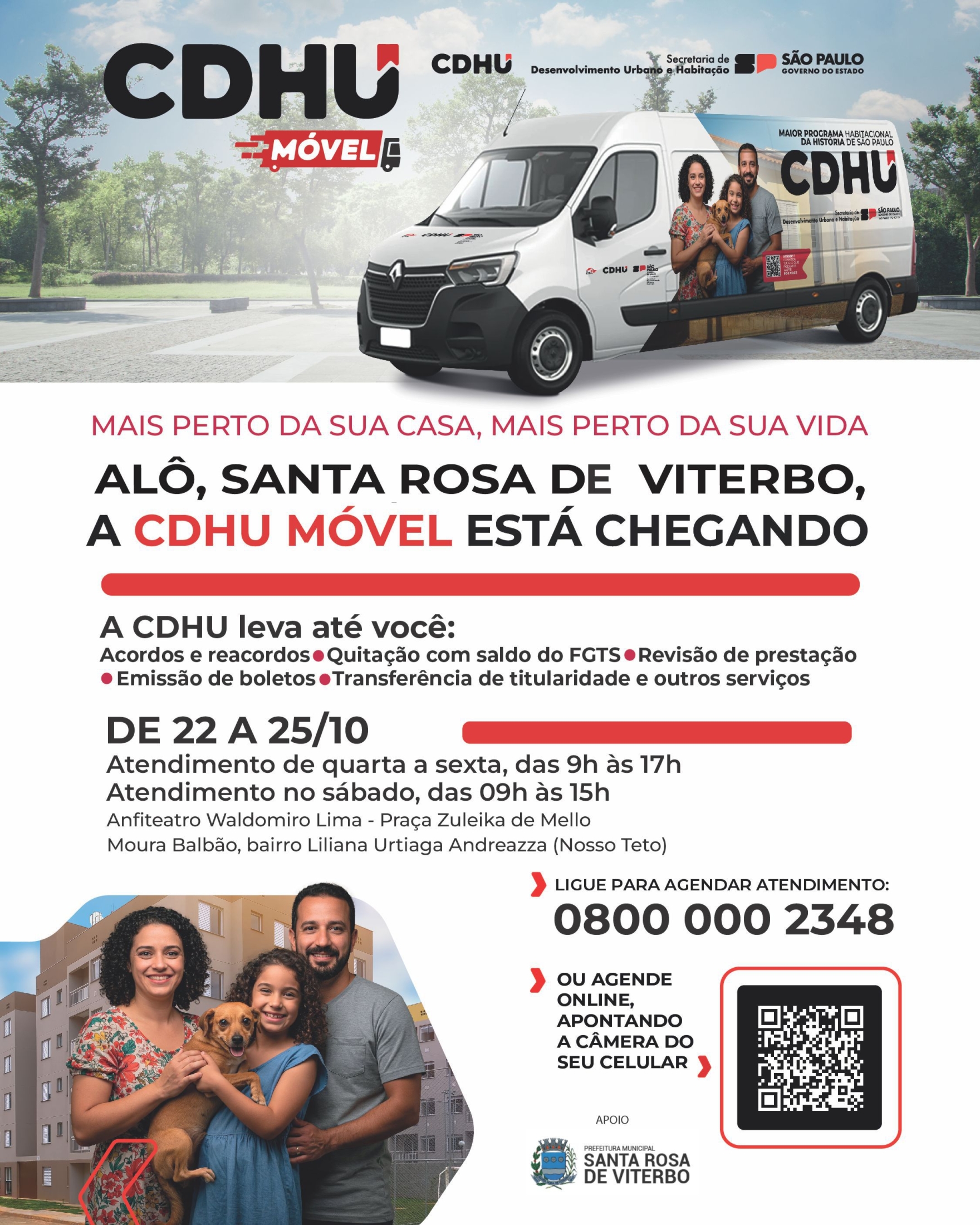 Em parceria com a Prefeitura de Santa Rosa de Viterbo, a Companhia de Desenvolvimento Habitacional e Urbano (CDHU) traz à cidade o serviço CDHU Móvel, uma unidade itinerante que oferecerá atendimento direto aos mutuários da região entre os dias 22 e 25 de outubro.