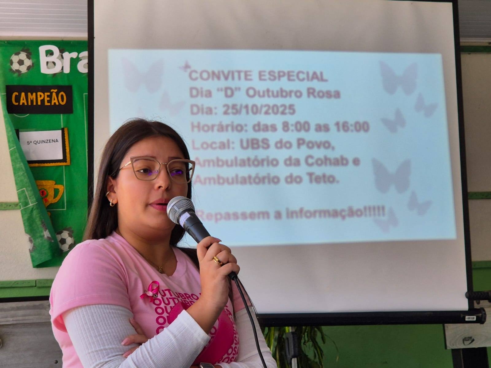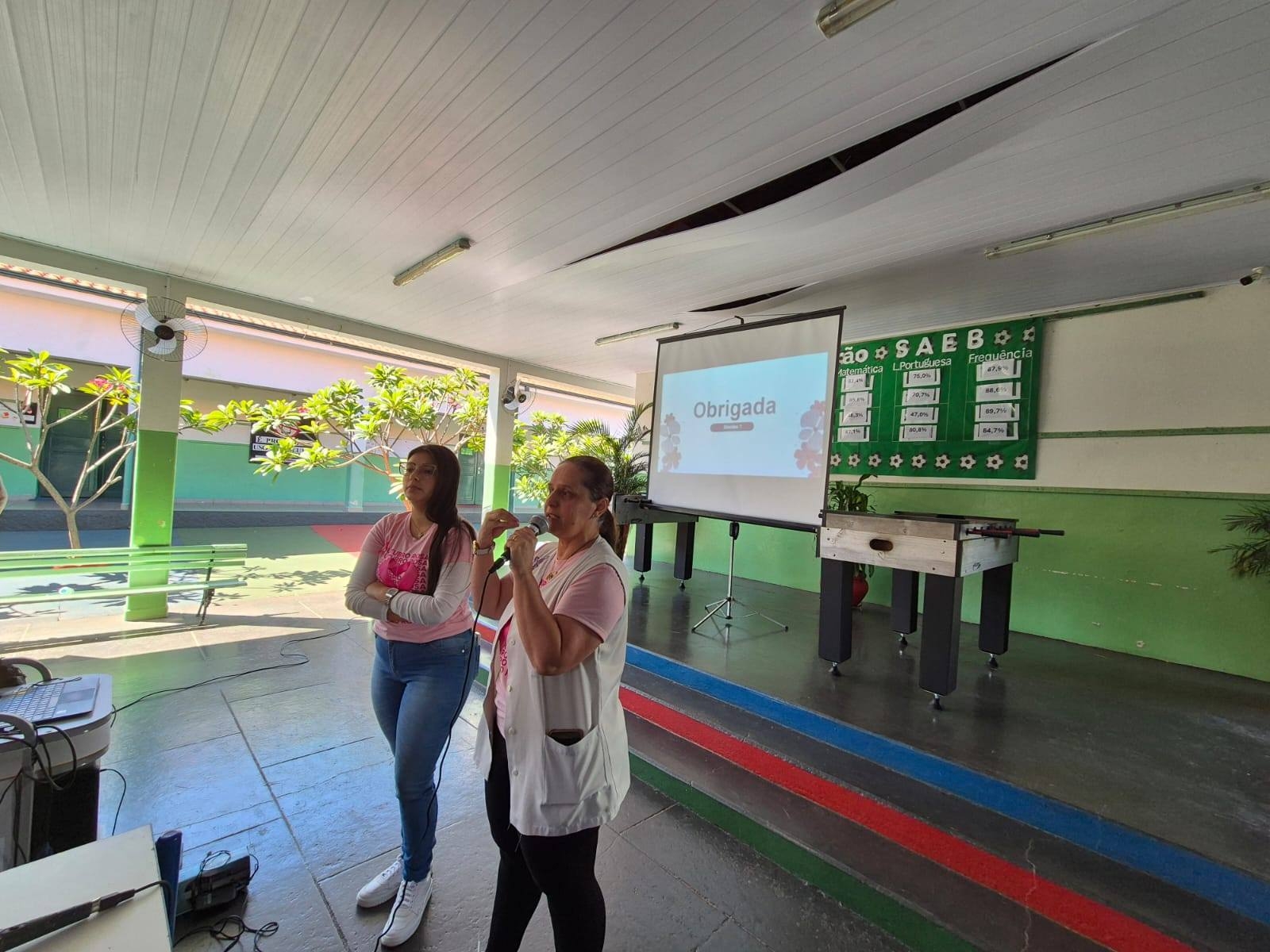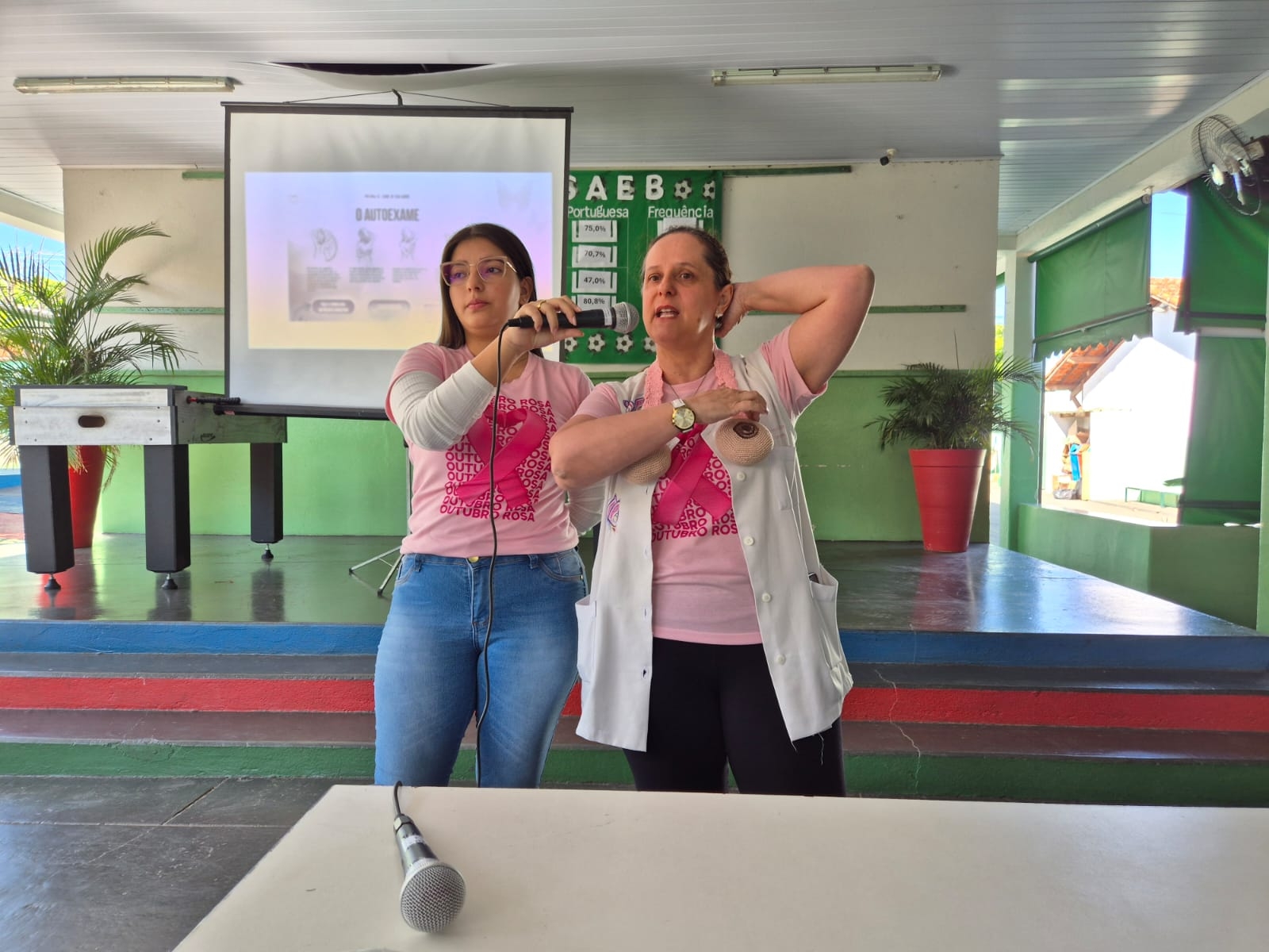 No tema Outubro Rosa, as enfermeiras Janaína e Maria Eduarda, da UBS do Povo, abordaram a importância da prevenção e do diagnóstico precoce do câncer de mama na escola Vergínio Melloni.