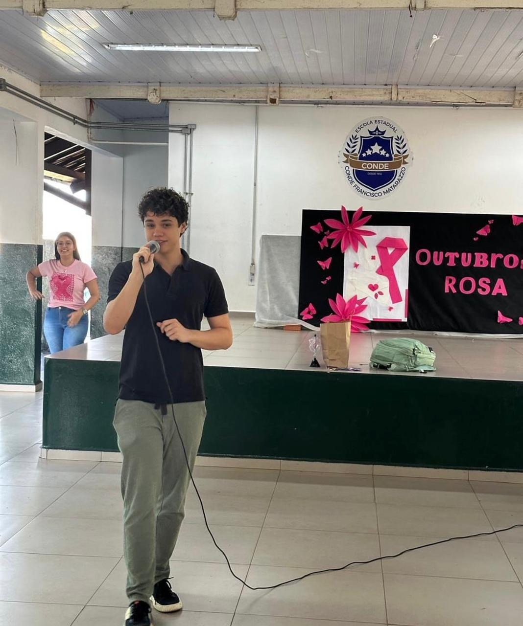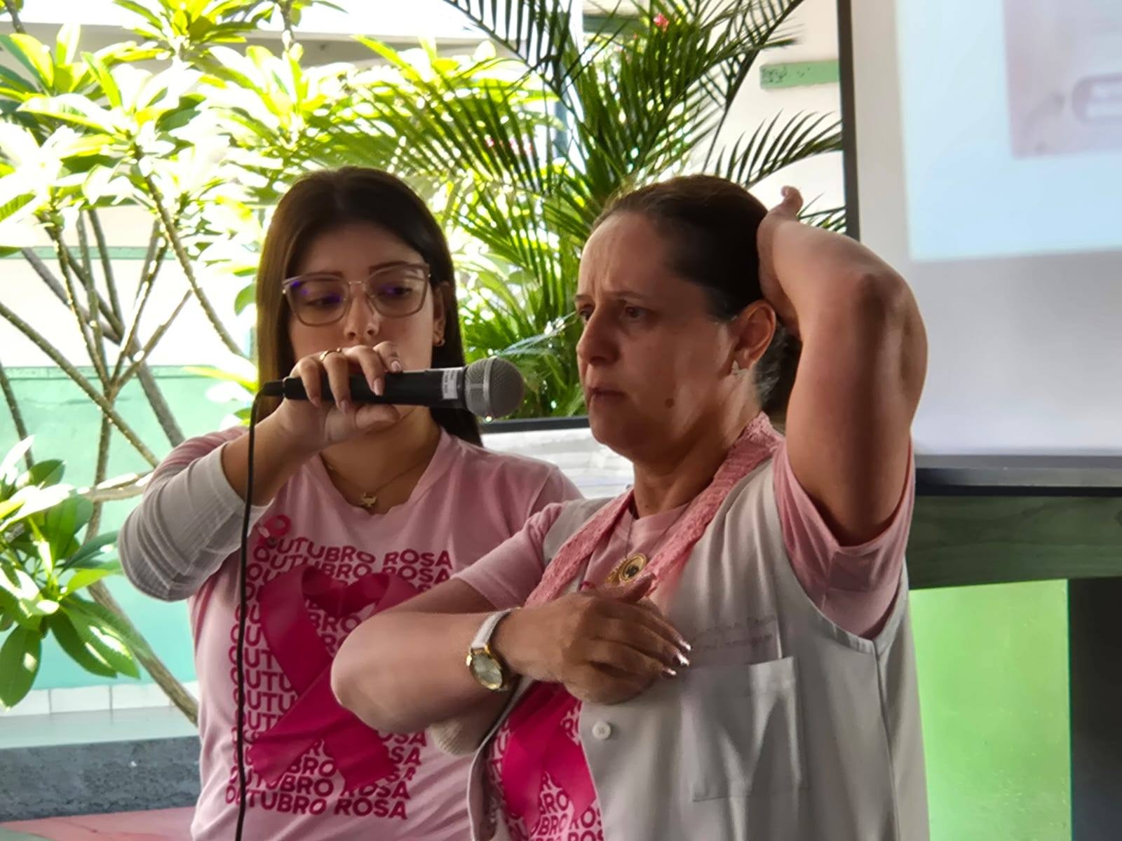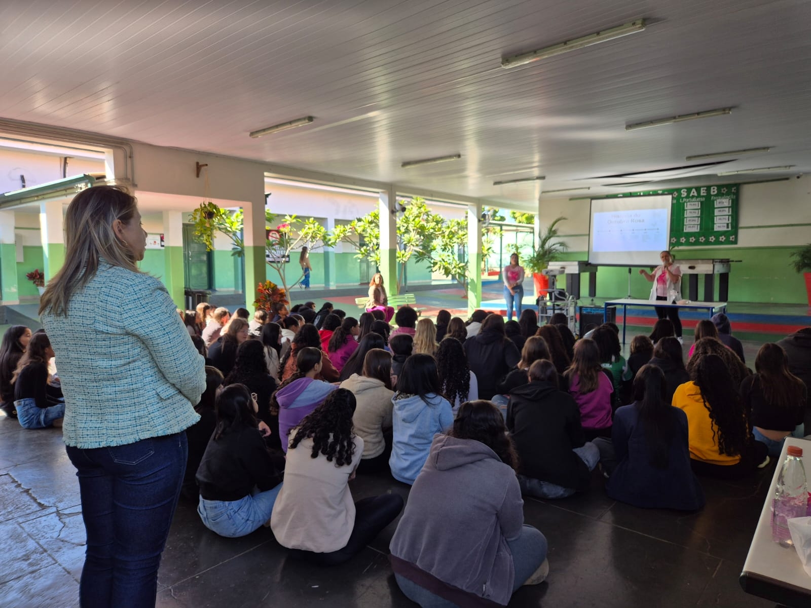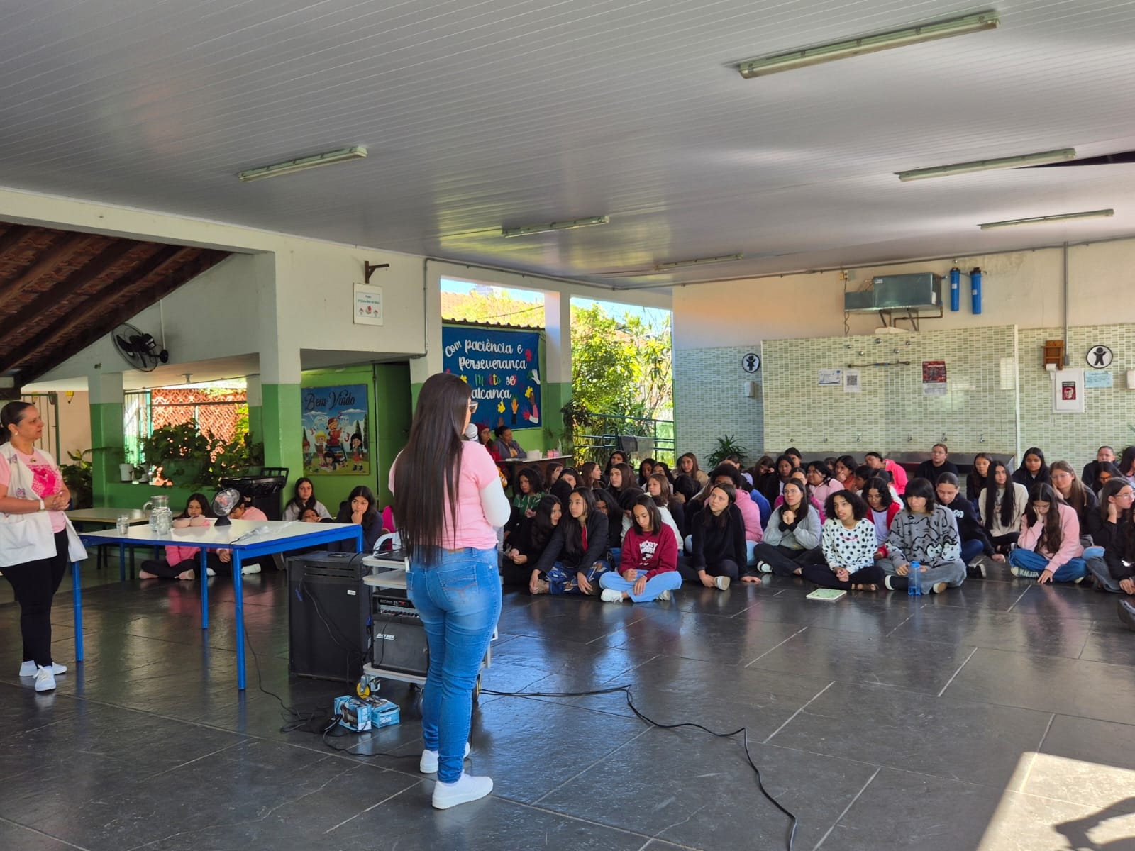 No tema Outubro Rosa, as enfermeiras Janaína e Maria Eduarda, da UBS do Povo, abordaram a importância da prevenção e do diagnóstico precoce do câncer de mama na escola Vergínio Melloni.