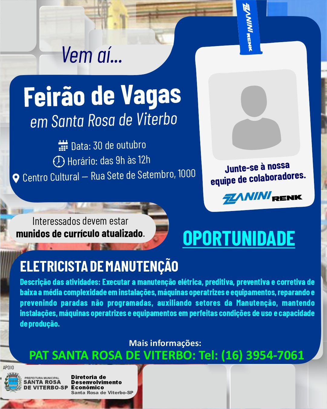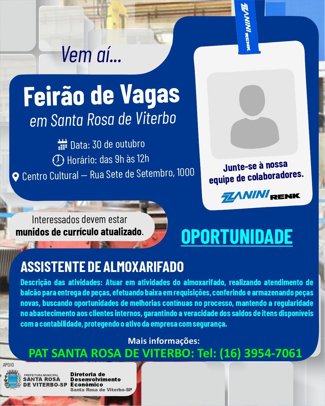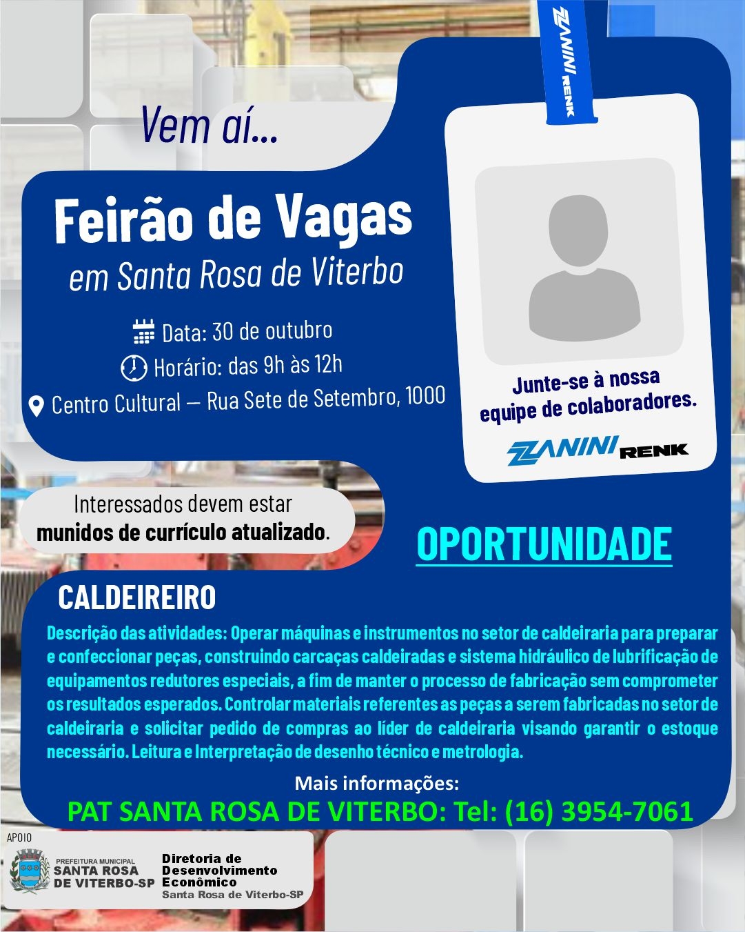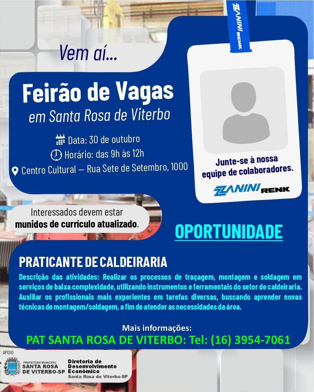 Com o apoio da Prefeitura Municipal, a empresa Zanini Renk, de Cravinhos, realiza amanhã (30 de outubro) um Feirão de Vagas em Santa Rosa de Viterbo. O evento acontece das 9h às 12h, no Centro Cultural (Rua Sete de Setembro, 1000).
