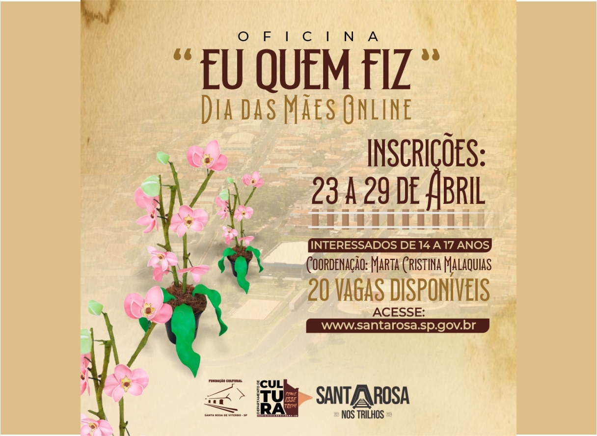 Com objetivo de Incentivar a prática do artesanato ,estimulando a troca de experiências, lazer, integração e autoestima, o Departamento de Cultura e a Fundação Cultural de Santa Rosa de Viterbo oferece aos interessados de 14 a 17 anos , Oficina “Eu que fiz”- Dia das Mães , que acontecerá de forma on line conforme informações abaixo: