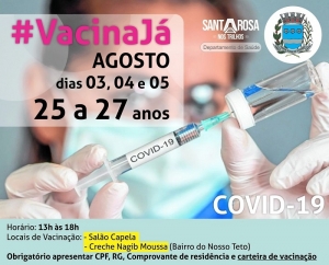 Dando sequência ao programa de vacinação na cidade de Santa Rosa de Viterbo, serão vacinadas nos dias 3, 4 e 5 de agosto, as pessoas de 25 a 27 anos.