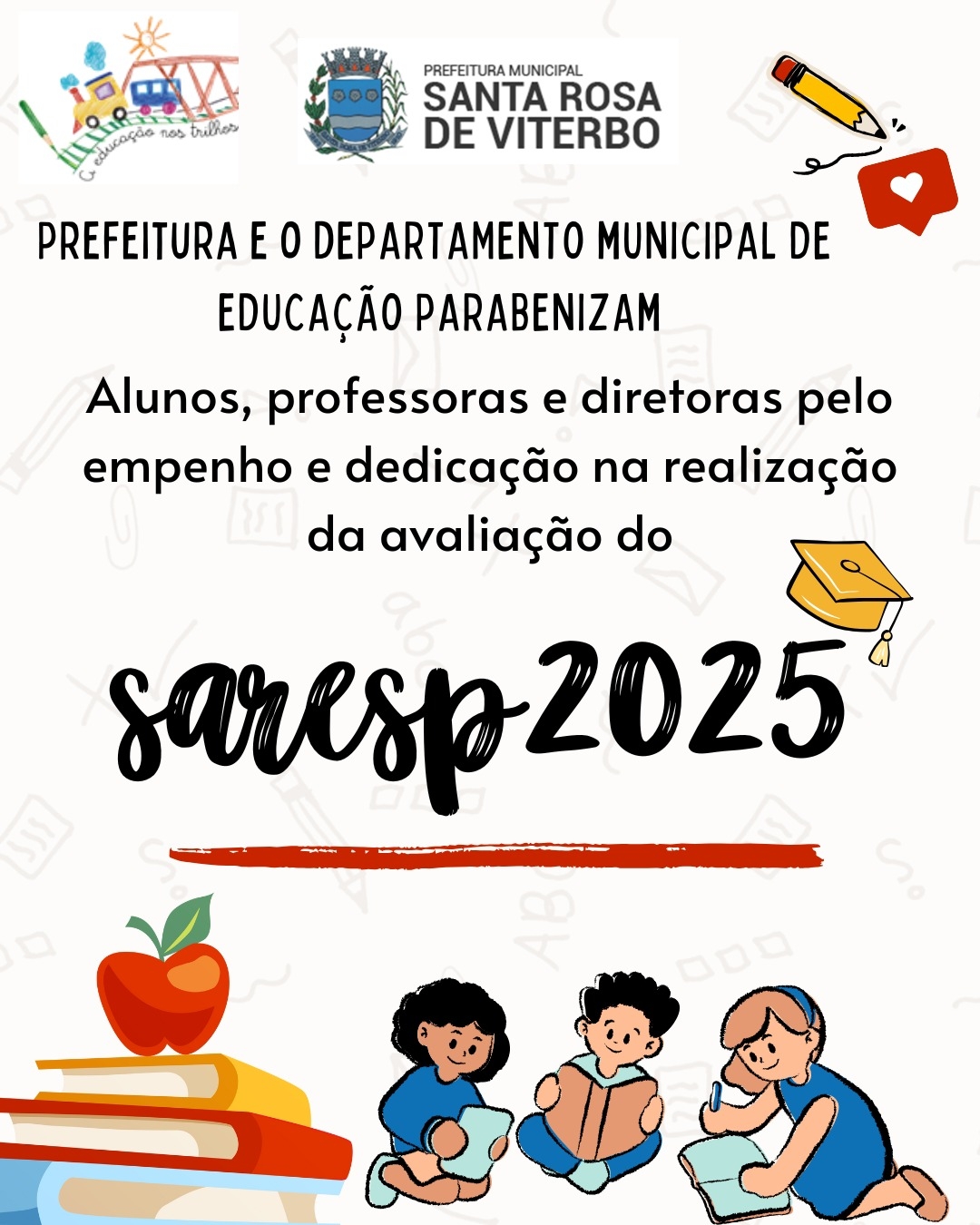 O Departamento Municipal de Educação parabeniza os alunos, as professoras e diretoras da rede municipal na realização da avaliação do SARESP 2025!
