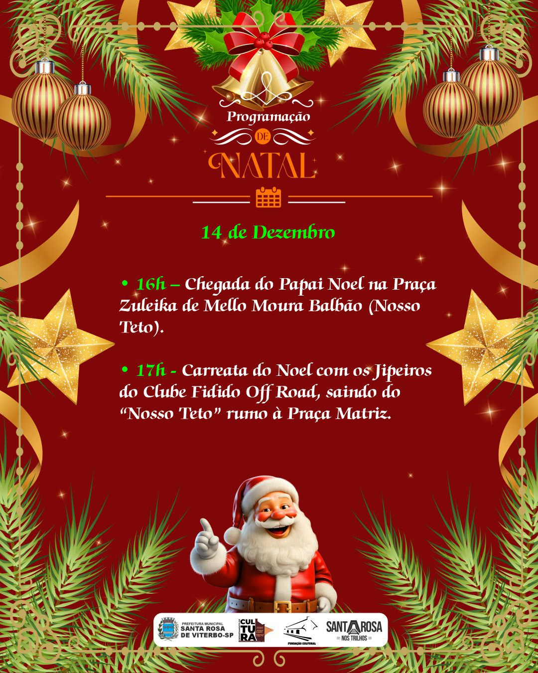 • 17h – Carreata do Noel com os Jipeiros do Clube Fidido Off Road, rumo à Praça Matriz.