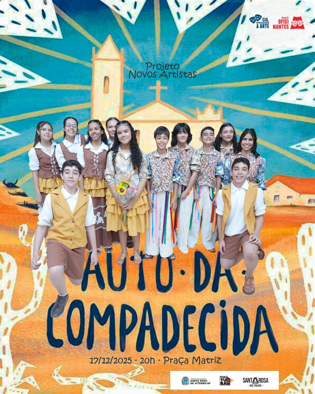 A programação natalina segue com destaque para o teatro nesta quarta-feira, 17 de dezembro. Às 20h, a Praça Matriz recebe o espetáculo “Auto da Compadecida”, apresentado pelo Projeto Novos Artistas – Especial Ariano Suassuna.