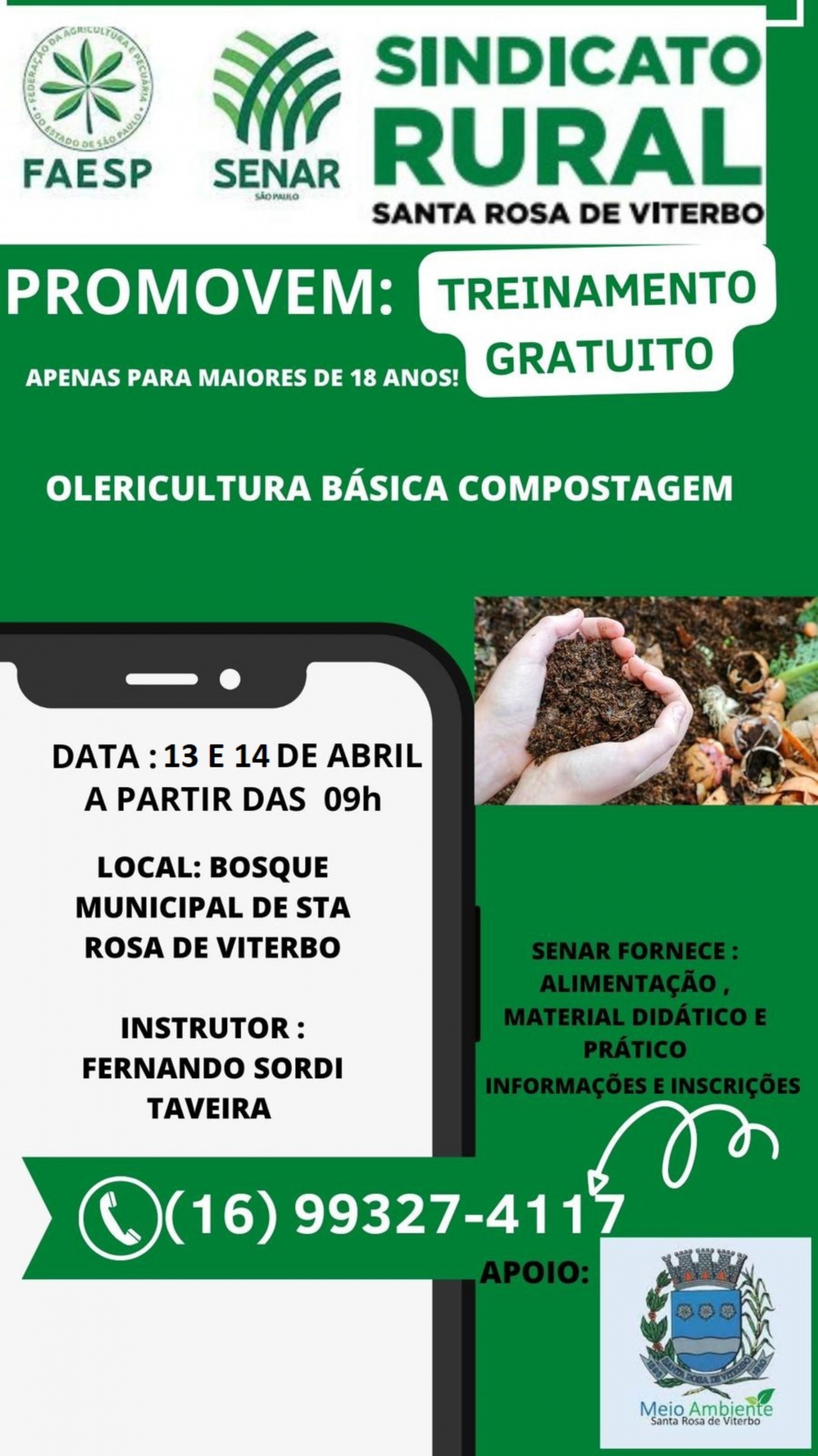 Em comemoração ao dia 15 de abril - Dia Nacional da Conservação do Solo, o Departamento de Meio Ambiente da Prefeitura Municipal, em parceria com o Serviço Nacional de Aprendizagem Rural (Senar) e o Sindicato Rural, traz um treinamento gratuito em Olericultura Básica de Compostagem nesta quinta e sexta-feira, em Santa Rosa. A ação, que ocorrerá no Bosque Municipal, atende ao artigo 14 da Lei Municipal 5080/2022, ainda tem vagas disponíveis.