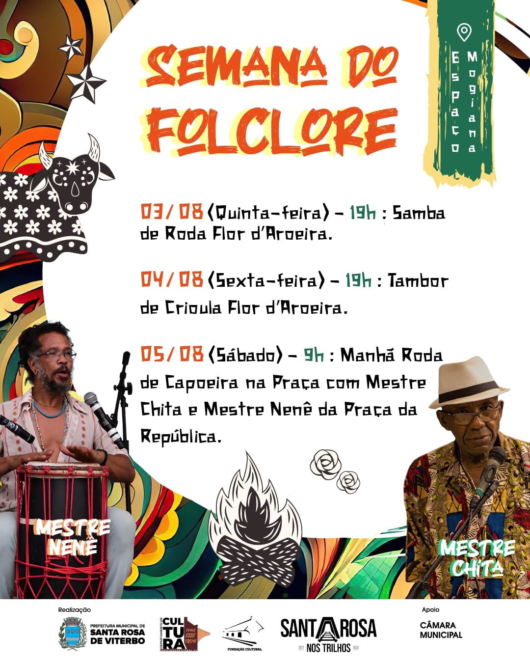 O evento também contará com a presença da Congada da cidade de Franca. Programe-se e participe. A realização é da Prefeitura de Santa Rosa de Viterbo através do Departamento de Cultura e a Fundação Cultural, com apoio da Câmara Municipal.