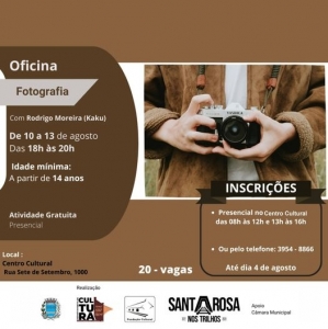 Ministrada pelo fotógrafo profissional Rodrigo Moreira (Kaku), a Oficina começa nesta quinta-feira e terá duração de 04 dias. Interessados, que tenham idade a patir de 14 anos, podem procurar o Centro Cultural das 08h00 às 12h00 e das 13h00 às 16h00 para efetuar a inscrição.
