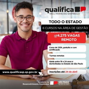 O Governo de São Paulo, por meio da Secretaria de Desenvolvimento Econômico, abriu na terça-feira (02) inscrições para 4.275 vagas em seis opções de cursos remotos e gratuitos do Qualifica SP “Meu Primeiro Emprego”, para todo estado de São Paulo. A ação é destinada a jovens de 16 a 24 anos com ensino fundamental completo que buscam inserção no mercado de trabalho, principalmente nas áreas do setor produtivo.