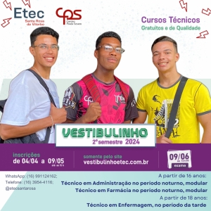 Plantão das inscrições: ETEC de Santa Rosa de Viterbo, das 07h00 às 13h00 e das 13h30 às 20h00.