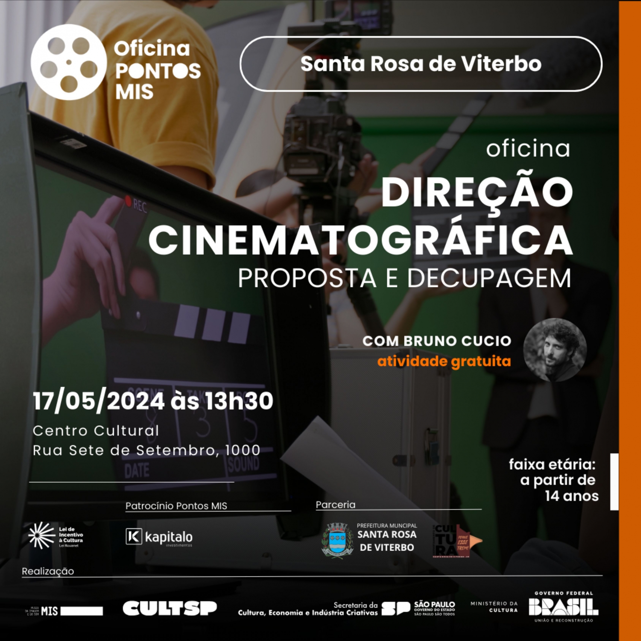 Em parceria com o Pontos Mis, o Departamento de Cultura e a Fundação Cultural promovem, no dia 17 de maio, a Oficina: Direção Cinematográfica - Proposta e Decupagem.