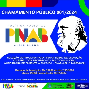Mais informações acesse o Edital no site da Prefeitura ou neste link: https://www.santarosa.sp.gov.br/pagina/254_Lei-Aldir-Blanc-2.html