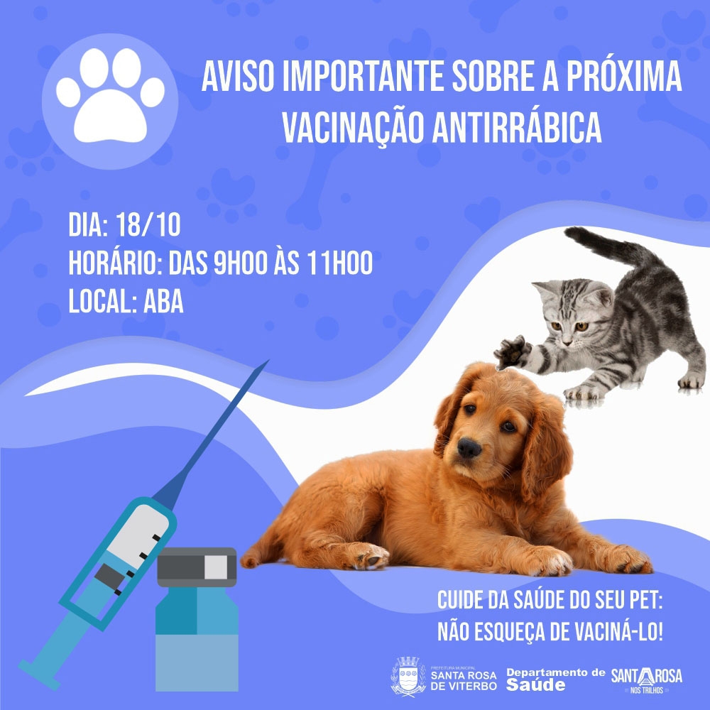 O Serviço Veterinário Municipal informa que não haverá vacinação Antirrábica na ABA nesta segunda-feira, 14/10.
