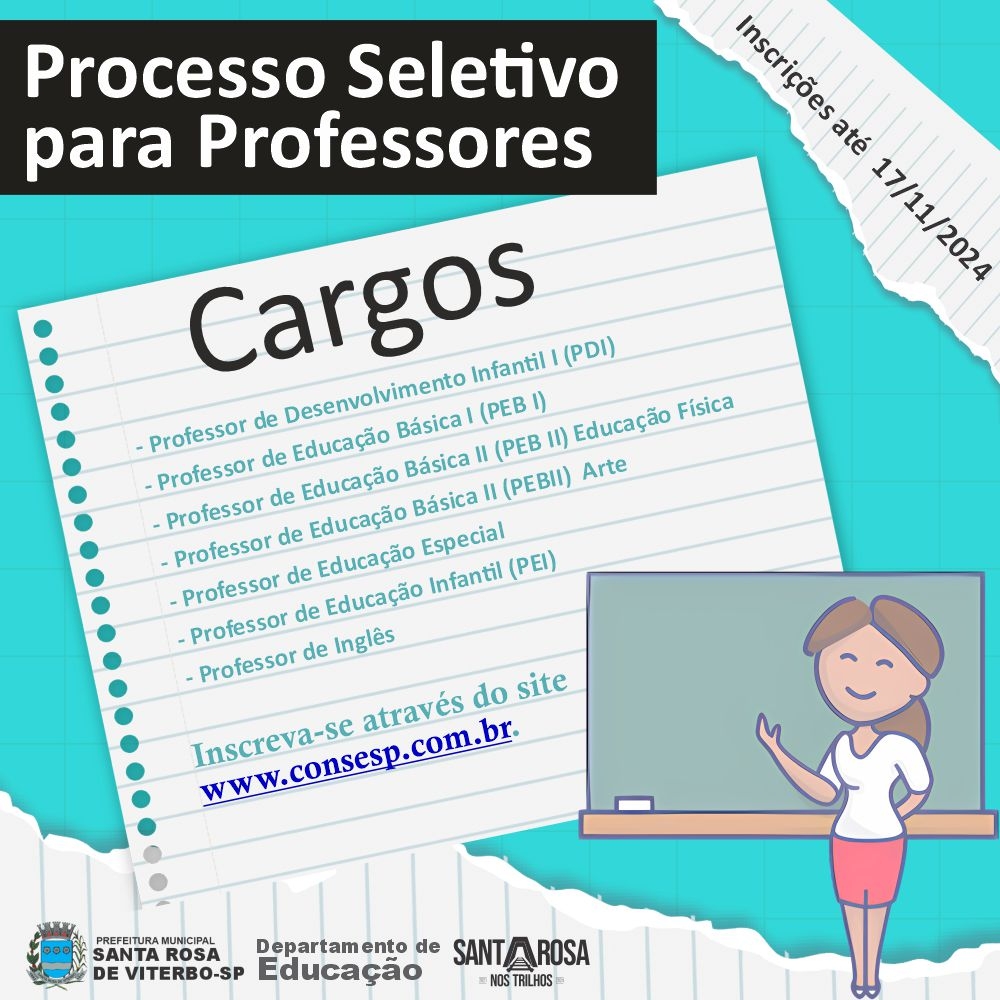 A Prefeitura Municipal de Santa Rosa de Viterbo lembra que restam apenas últimos dias para as inscrições no Processo Seletivo Nº 001/2024, destinado à contratação temporária de professores. As inscrições estão abertas até o dia 17 de novembro de 2024 e devem ser realizadas exclusivamente pelo site: www.consesp.com.br.