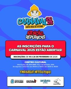 Interessados em constituir Repúblicas para o Carnaval 2025 devem efetuar o cadastro obrigatório de 18 a 26 de fevereiro, das 09h00 às 11h00 e das 14h00 às 16h00, no Centro Cultural de Santa Rosa de Viterbo, localizado à Rua Sete de Setembro, nº 1.000.