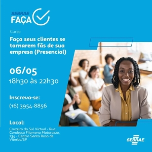 Convidamos todos os empreendedores de Santa Rosa de Viterbo a se inscreverem no curso presencial "Faça seus clientes se tornarem fãs de sua empresa". Nesta oficina, você irá aprender os conhecimentos básicos sobre fidelização de clientes, atendimento segmentado e marketing de relacionamento, ferramentas essenciais para o sucesso do seu negócio.
