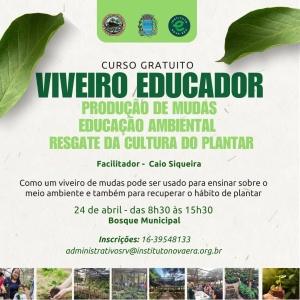 O programa de Educação Ambiental promove no próximo dia 24 de abril, no Bosque Municipal de Santa Rosa de Viterbo, a oficina gratuita "Viveiro Educador: Produção de Mudas, Educação Ambiental e Resgate da Cultura do Plantar". O curso acontece das 8h30 às 15h30 e promete um dia inteiro de aprendizado e conexão com a natureza.