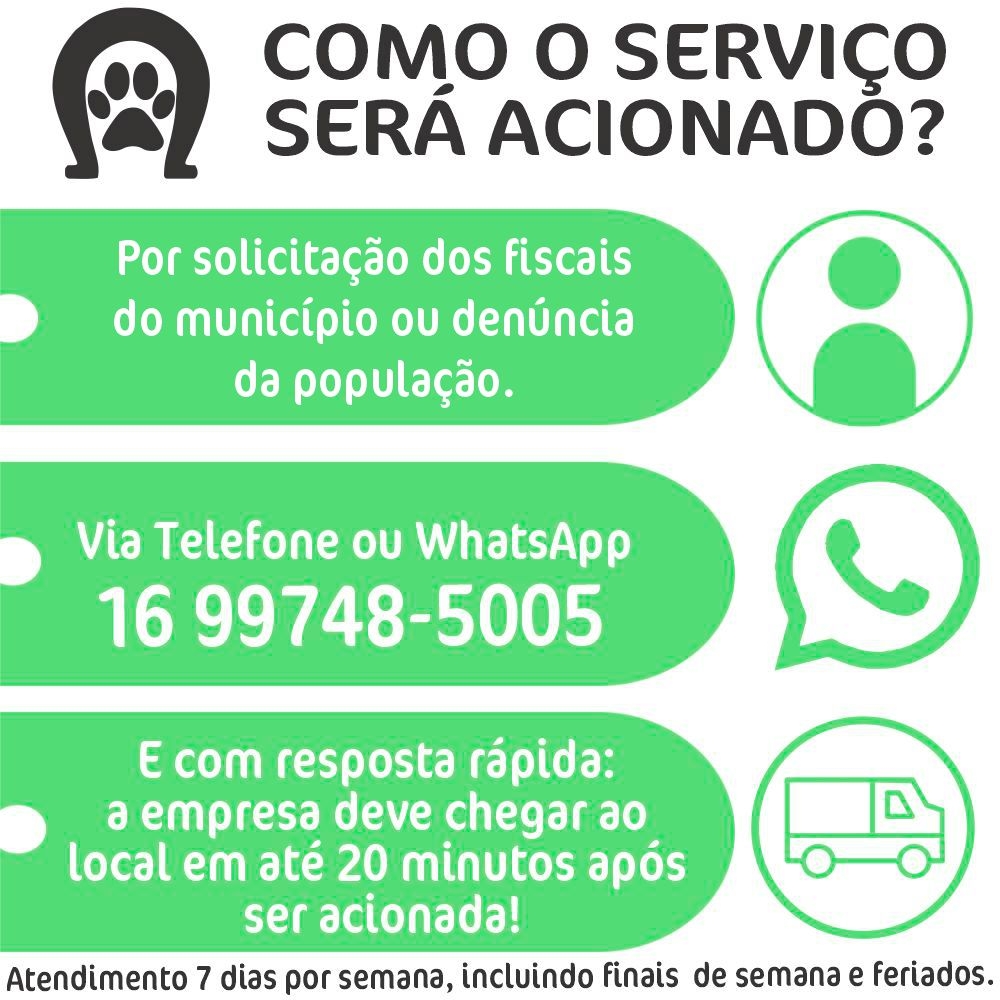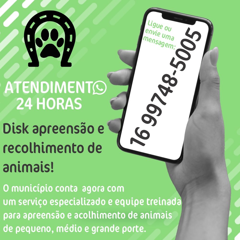 O município conta agora com um serviço especializado para apreensão e acolhimento de animais de pequeno, médio e grande porte. Tire suas dúvidas e ligue 16 99748-5005 para acionar o serviço, caso se depare com animais em vias públicas.