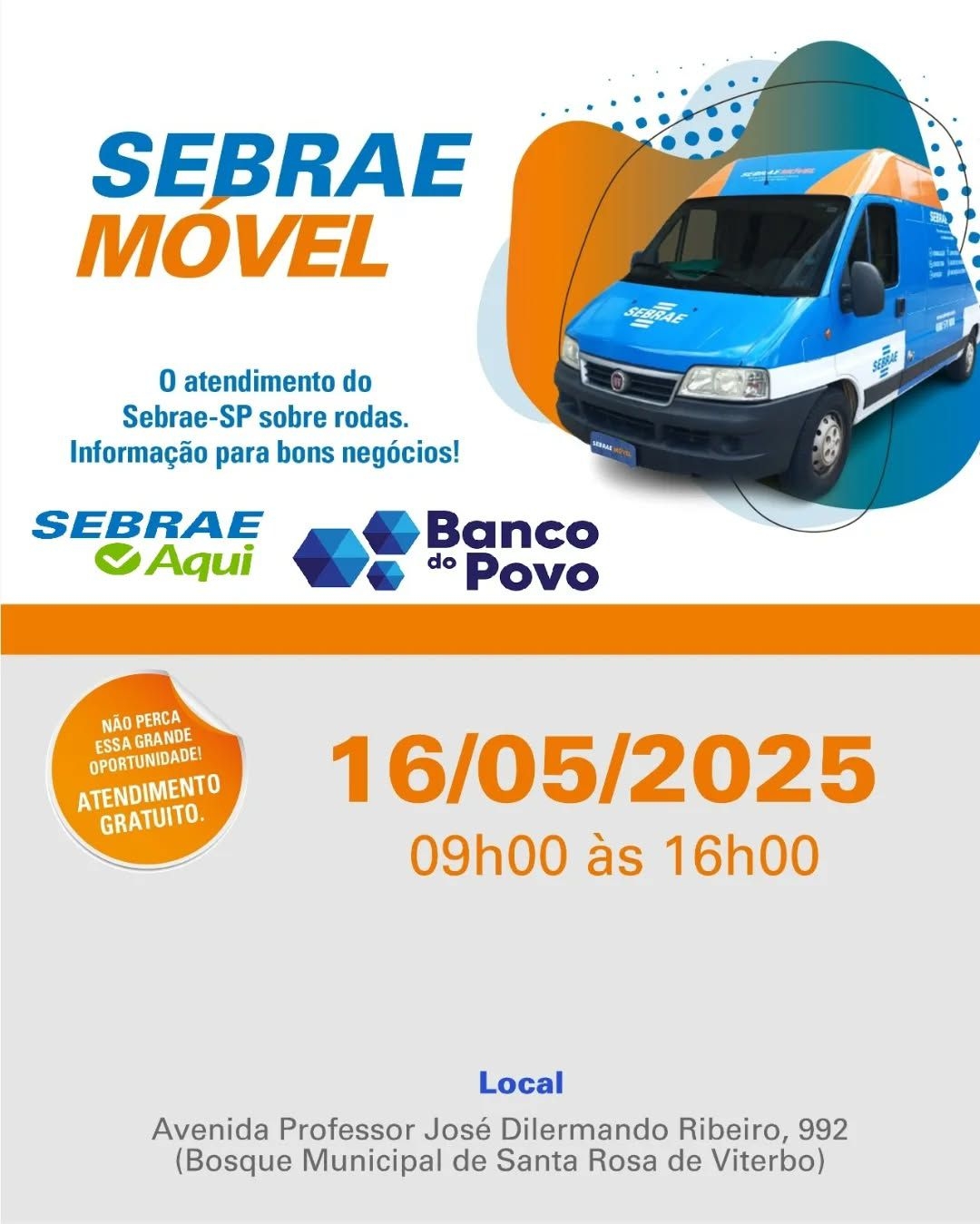 A Prefeitura Municipal de Santa Rosa de Viterbo, em parceria com o Sebrae Aqui e o Banco do Povo Paulista, informa que a unidade Sebrae Móvel estará na cidade no dia 16 de maio, das 9h às 16h, em frente ao Bosque Municipal.