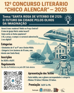 Estarão abertas, de 20 de maio a 4 de julho, as inscrições para o 12º Concurso Literário “Chico Alencar” – 2025, promovido pela Prefeitura de Santa Rosa de Viterbo. Com o tema “Santa Rosa de Viterbo em 2125: o futuro da cidade pelos olhos da imaginação”, o concurso desafia escritores de todas as idades a criarem textos que misturam cultura local e projeções futuristas, em gêneros como poesia, crônica, artigo de opinião e relato de memória.