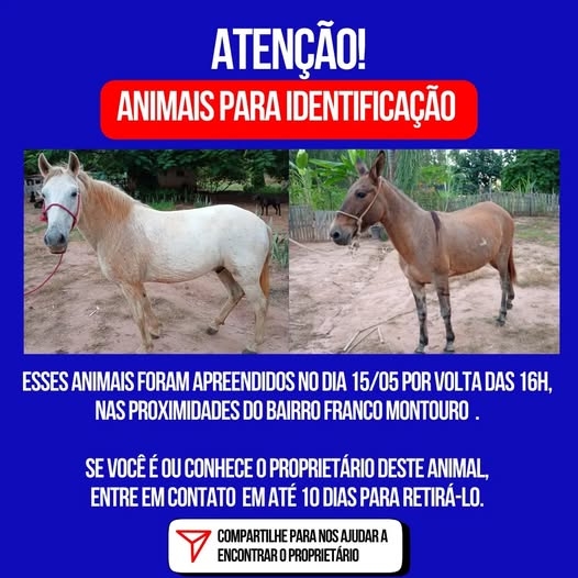 No dia 15/05, esses animais estavam soltos nas proximidades do bairro Franco Montoro, por volta das 16h, e foram apreendidos.