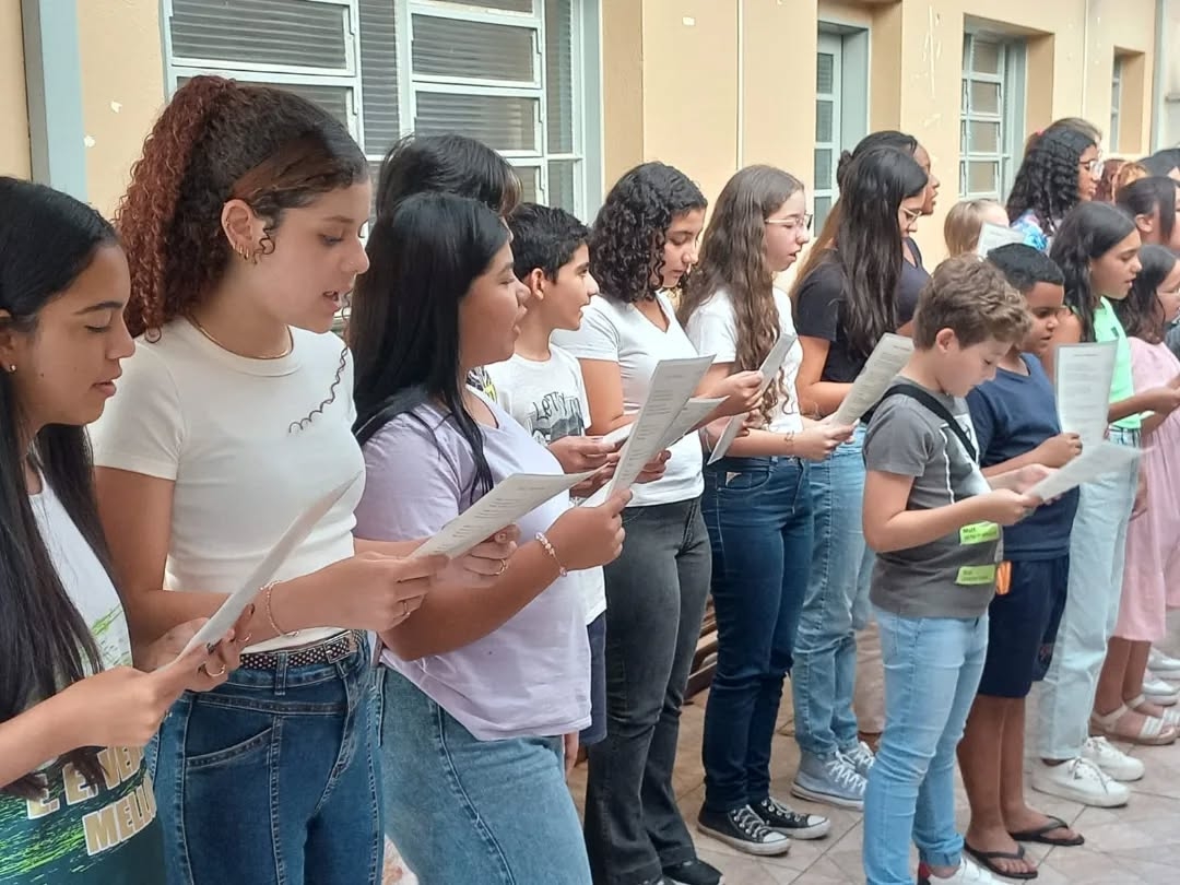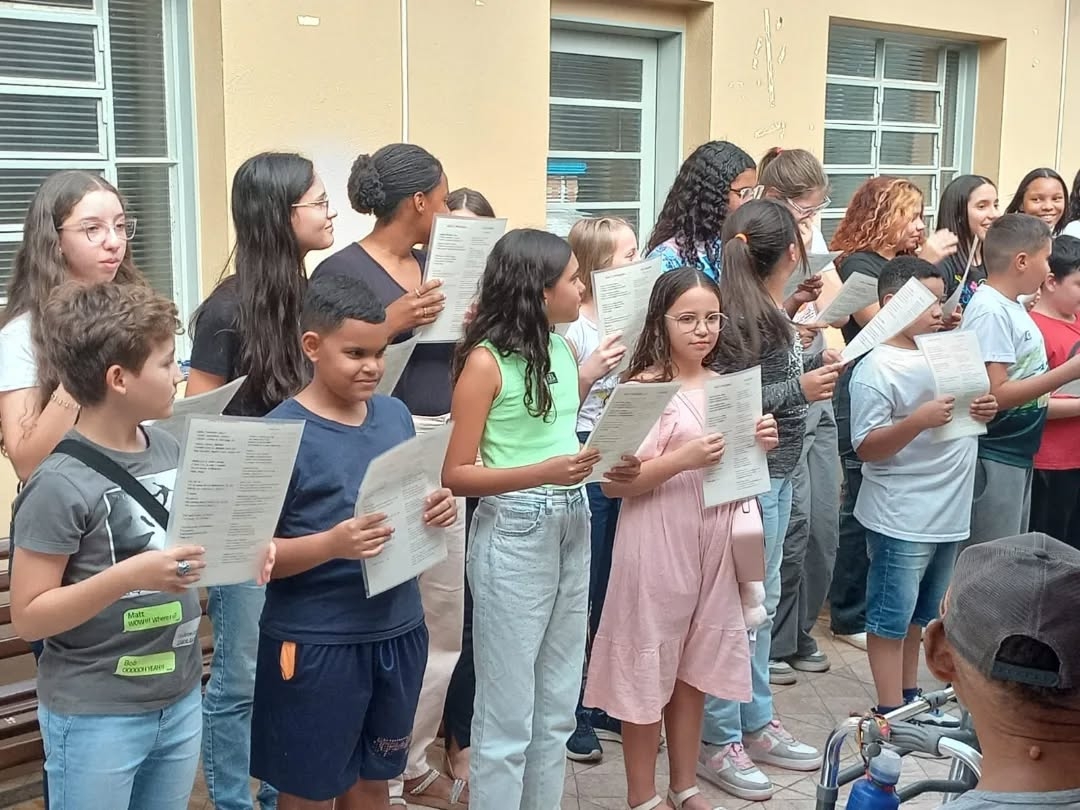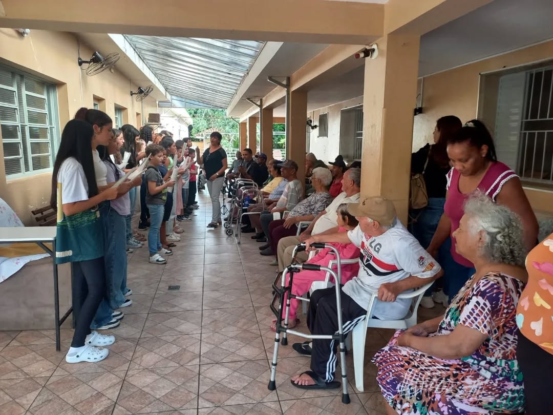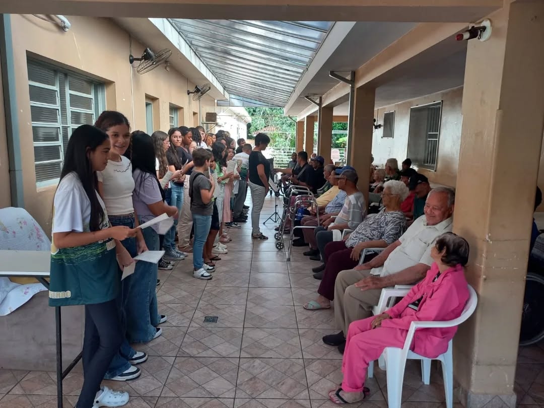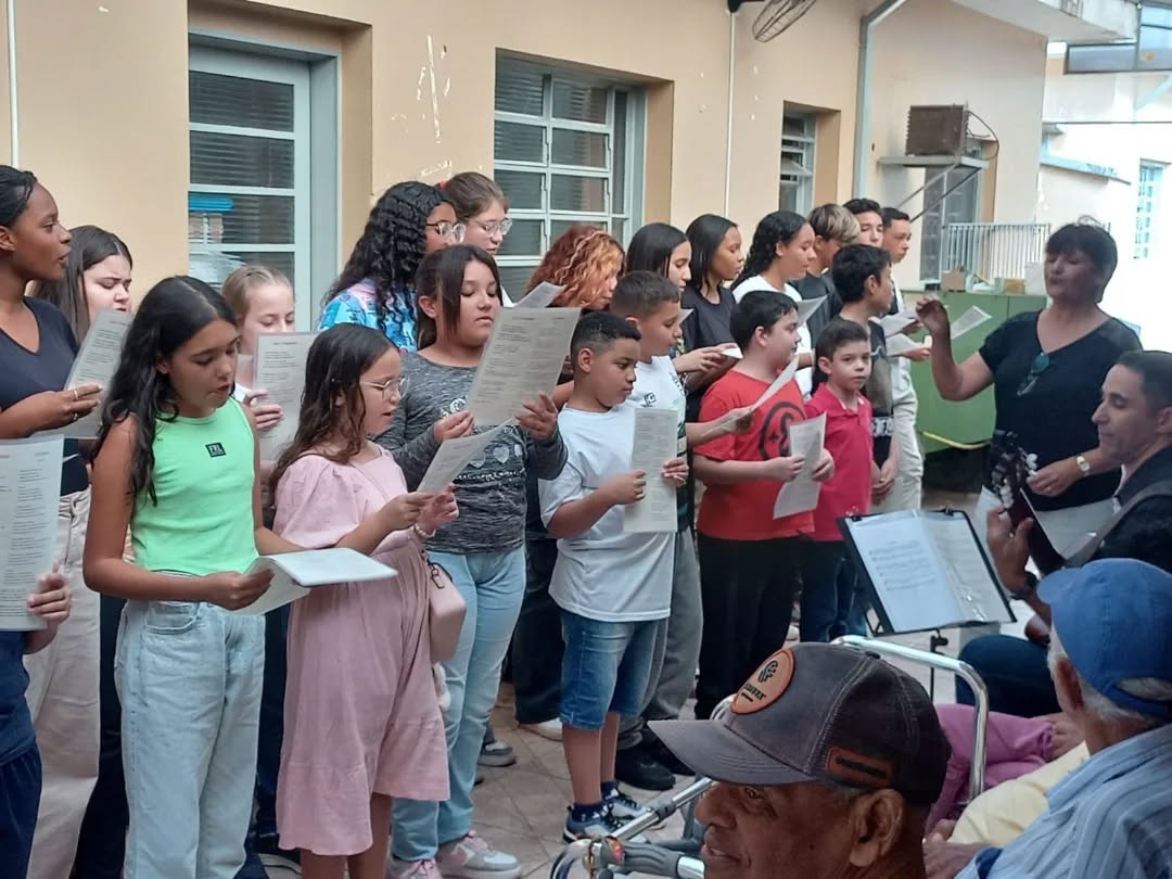 No dia 26 de maio, o Coral do Polo Guri de Santa Rosa de Viterbo proporcionou uma tarde repleta de música e emoção aos moradores e colaboradores do Lar São Vicente de Paulo. Alunos dos níveis sequenciais I, II e III encantaram o público com interpretações emocionantes de clássicos como “Duas Cirandas” (domínio público), “Trem da Serra” (Fabiana Pereira), “Não É Proibido” (Marisa Monte e Seu Jorge), “Maria, Maria” (Milton Nascimento) e “Felicidade” (Marcelo Janecci).