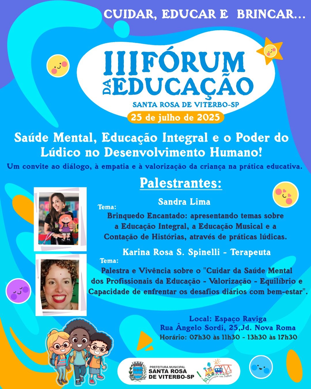 A Prefeitura de Santa Rosa de Viterbo, através do Departamento Municipal de Educação, promove nesta sexta-feira, dia 25 de julho o III Fórum da Educação, com o tema "Cuidar, Educar e Brincar". O evento será realizado no Espaço Raviga, no Jardim Nova Roma, em dois períodos: das 07h30 às 11h30 e das 13h30 às 17h30.