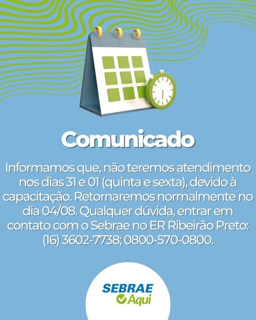 Em caso de dúvidas, entre em contato com o Sebrae no ER Ribeirão Preto: (16) 3602-7738 | 0800-570-0800.