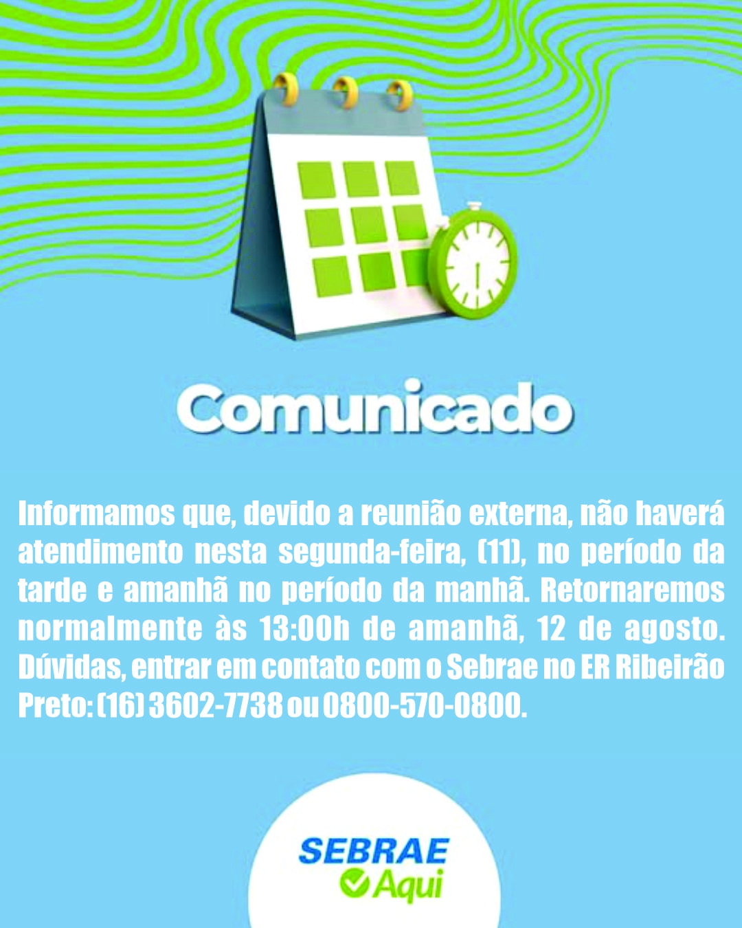 Em caso de dúvidas sobre o atendimento do Sebrae Aqui, entre em contato com o Sebrae no ER Ribeirão Preto: (16) 3602-7738 | 0800-570-0800.