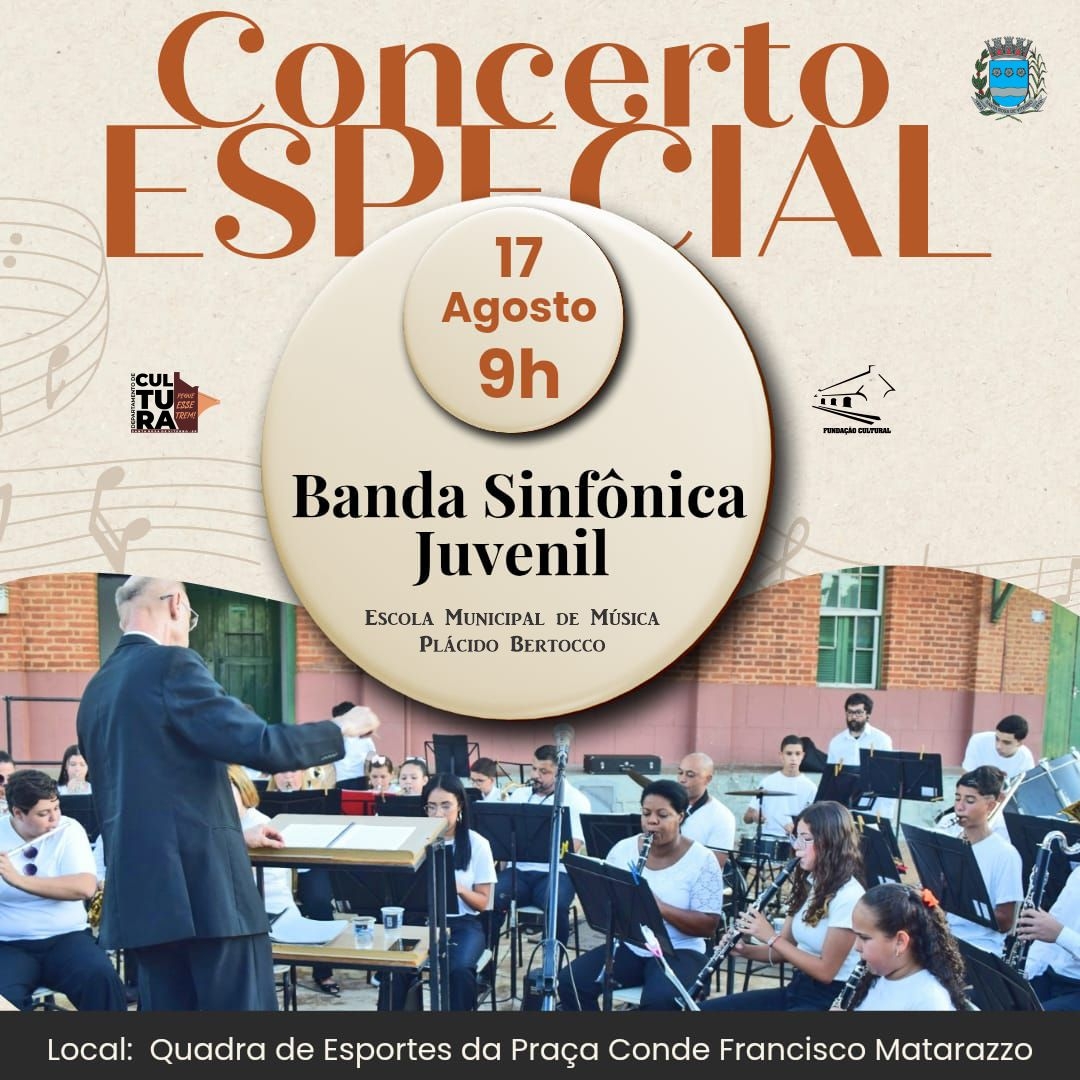A apresentação, que acontecerá na Quadra de Esportes da Praça Conde Francisco Matarazzo, contará com um repertório especial, com músicas alegres e de excelente qualidade. Sob a regência do Maestro Maurílio de Oliveira Júnior, os talentosos alunos de nível intermediário da Escola Municipal de Música "Plácido Bertocco" prometem encantar o público.